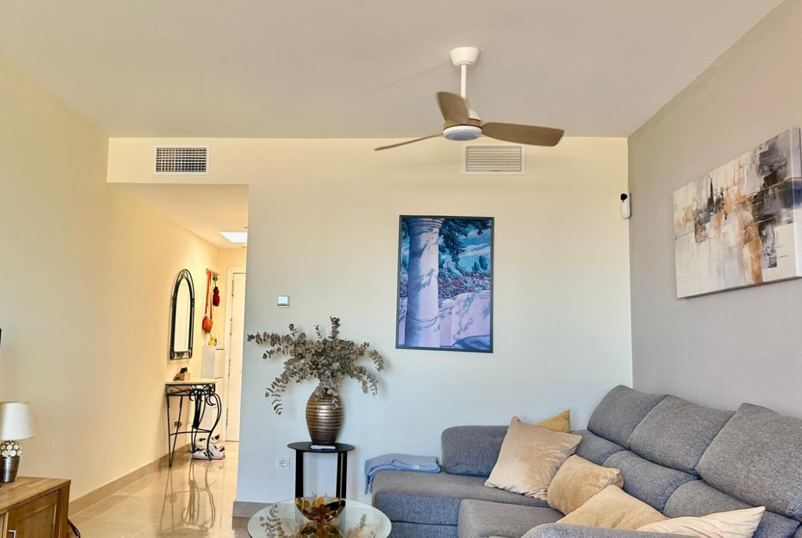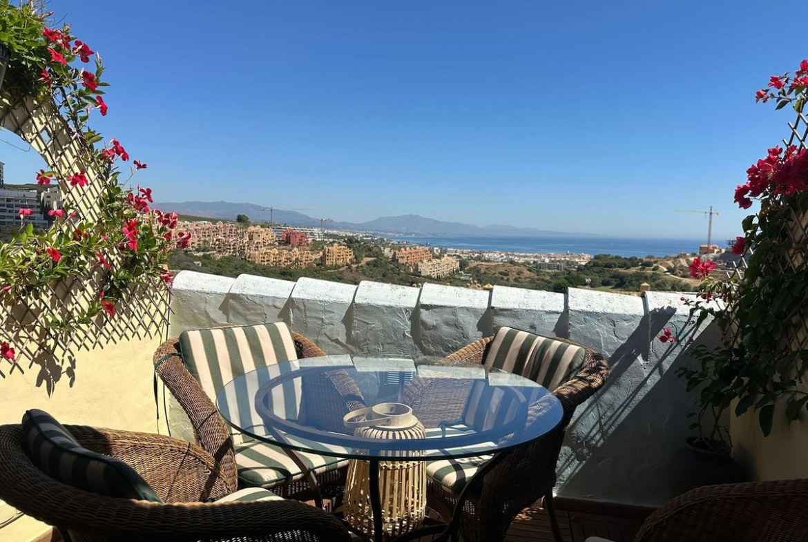 This beautiful penthouse apartment has been recently renovated and offers stunning, panoramic views towards the Mediterranean sea and coastline. Two spacious bedrooms with built in wardrobes and two modern bathrooms. Fully fitted kitchen and a bright living and dining area leading onto its private terrace. This property also has a further two terraces allowing for sun and shade at various times of the day. Hot and cold air-conditioning throughout.