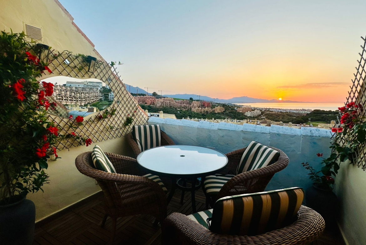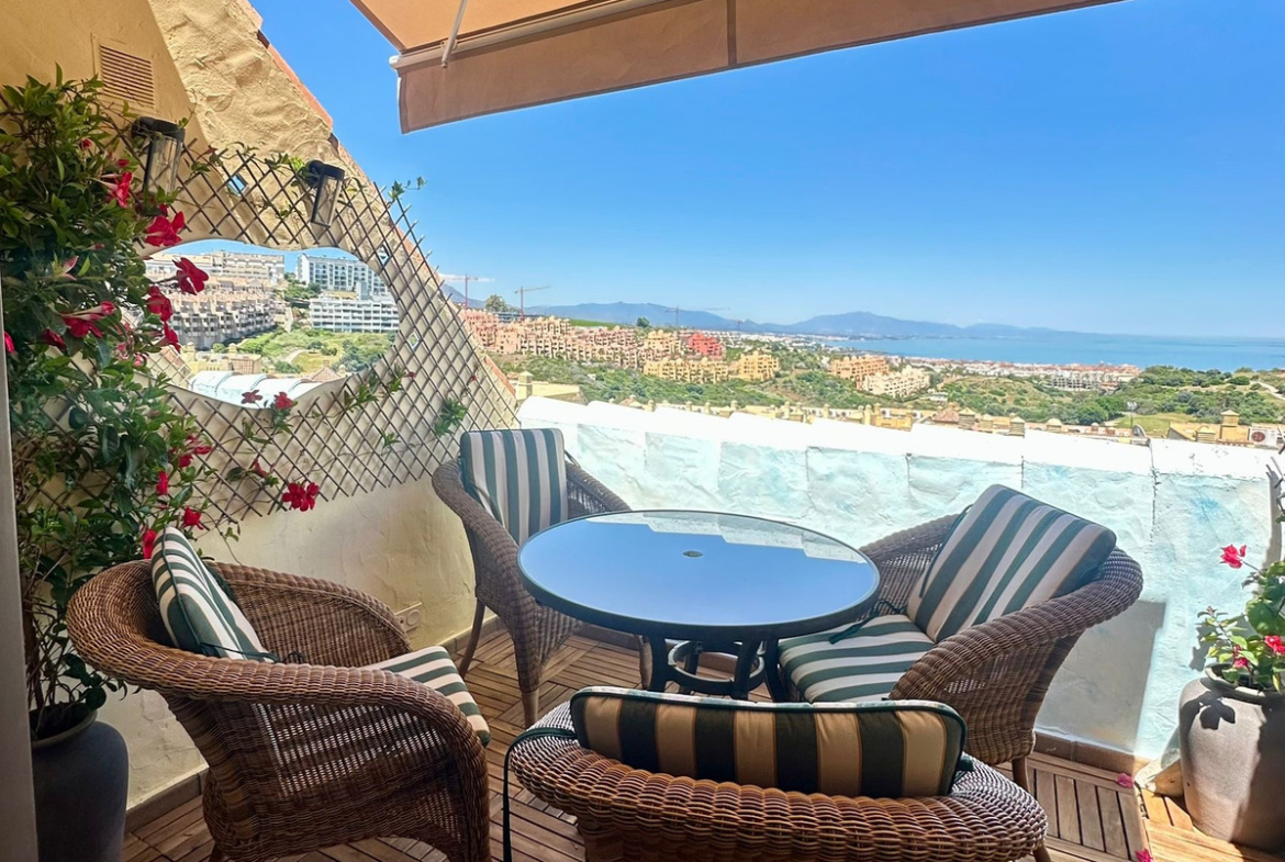 Located in the prestigious and secure urbanization of La Duquesa Village, this unique apartment, fully refurbished in June 2024, offers an exceptional living environment with one of the most stunning views of the Costa del Sol. It features two spacious bedrooms with built-in wardrobes, two modern bathrooms, a bright living room with direct access to one terrace, as well as two additional terraces providing spectacular panoramas at different times of the day. The fully equipped, contemporary kitchen combines functionality with style.