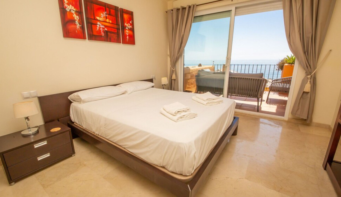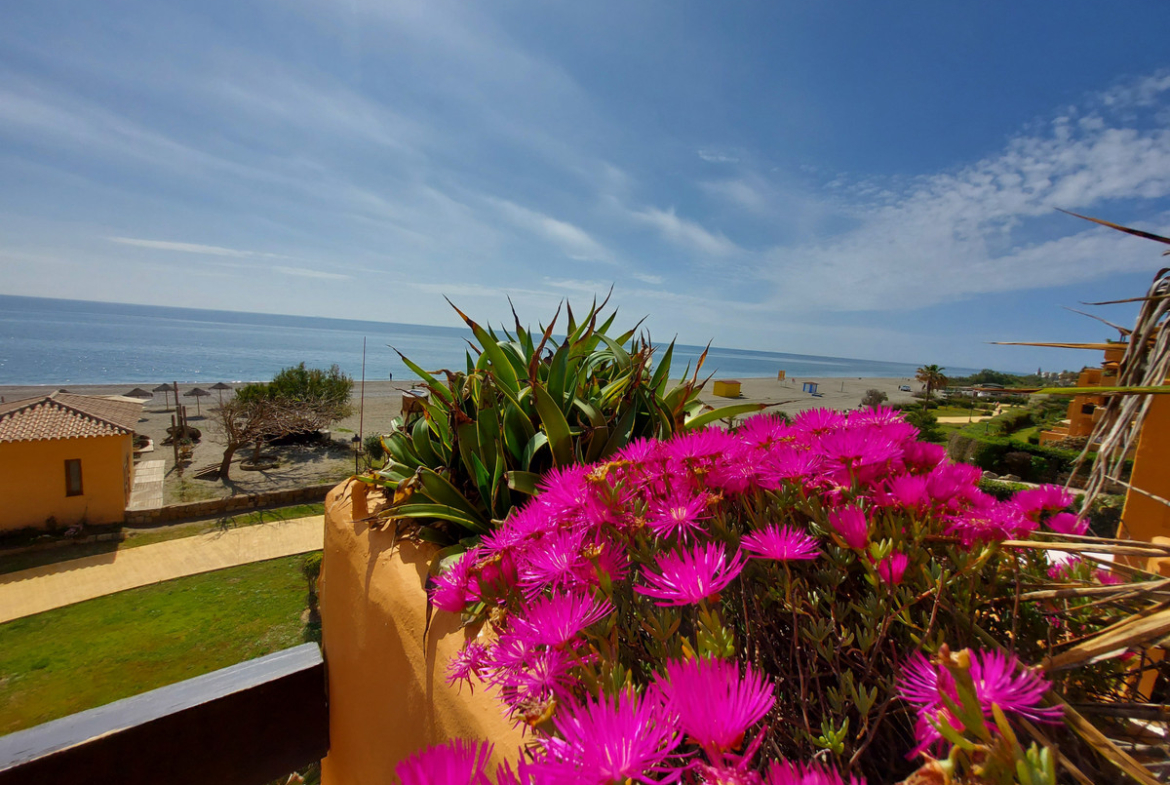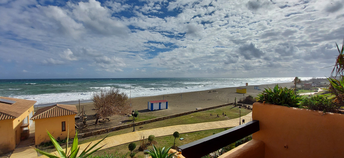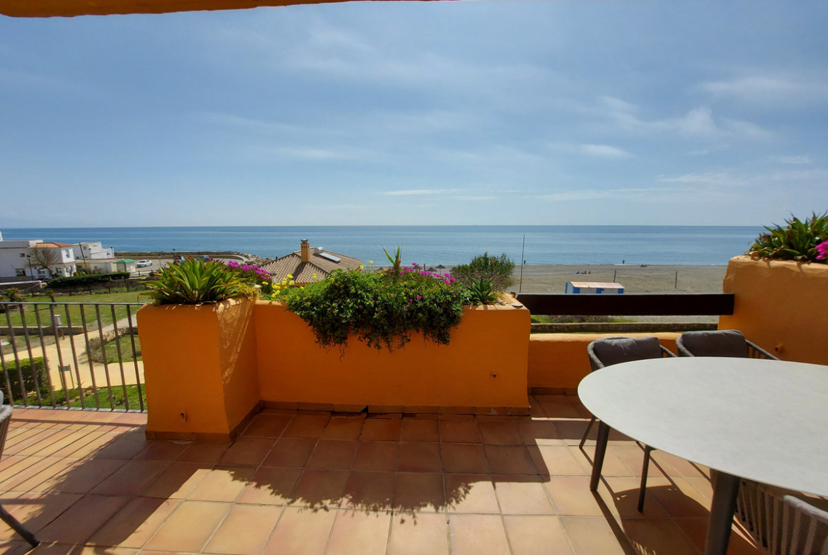 Urb. Los Granados – Sought after front line Beach development. A well presented modernised (new top of the range kitchen) front line beach 2 bedroom corner apartment with uninterrupted beach and sea views from the terrace. The complex is located on the beachfront with a large lagoon style swimming pool set in spacious grounds. The complex also has underground parking, 24hr security and is a short walk along the beach to the fishing village of Castillo and Duquesa marina.