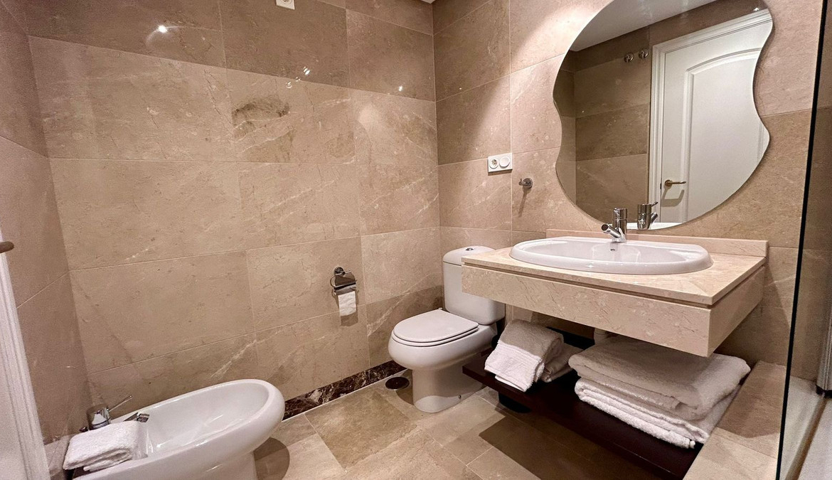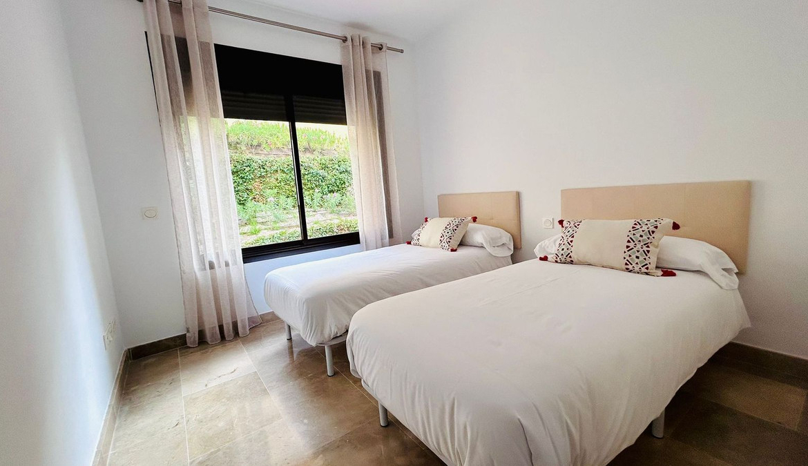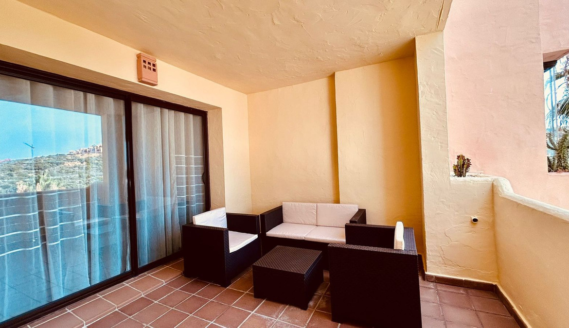 Located in the exclusive Duquesa Village development, this beautiful apartment offers a perfect combination of comfort, tranquility, and spectacular sea views. Located just minutes from the beach, golf courses, and all amenities, it boasts excellent connections to the highway, making it an ideal location for both living and investing. The 115 m² home, in perfect condition, stands out for its brightness and south-facing orientation, providing morning sun and a feeling of spaciousness. Although listed as a first floor, its actual height is equivalent to a third floor, ensuring privacy and unobstructed views. It features two double bedrooms, two full bathrooms, a spacious living-dining room with direct access to a covered terrace with open views, a fully equipped kitchen, and a separate laundry room. It includes an underground parking space, a storage room, and a valid tourist license, perfect for vacation rentals. The development offers 24-hour security, five communal pools surrounded by gardens, a paddle tennis court, and is pet-friendly, all in a well-maintained and privileged setting.