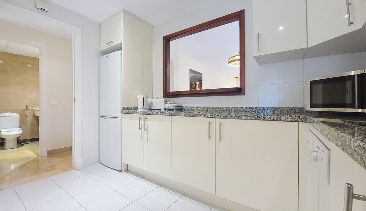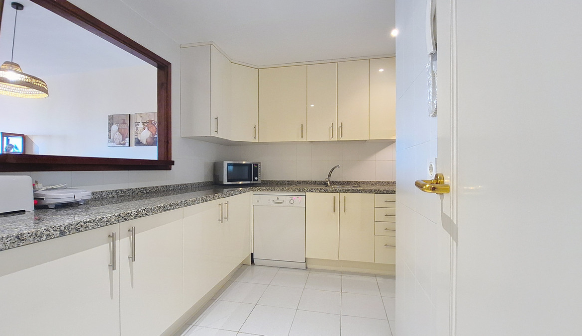 The master bedroom includes an en-suite bathroom and direct access to the beautiful terrace. The second bedroom overlooks the green areas of the development. The property also offers a guest bathroom, a practical utility room, and a kitchen with an open window to a bright and spacious living area.