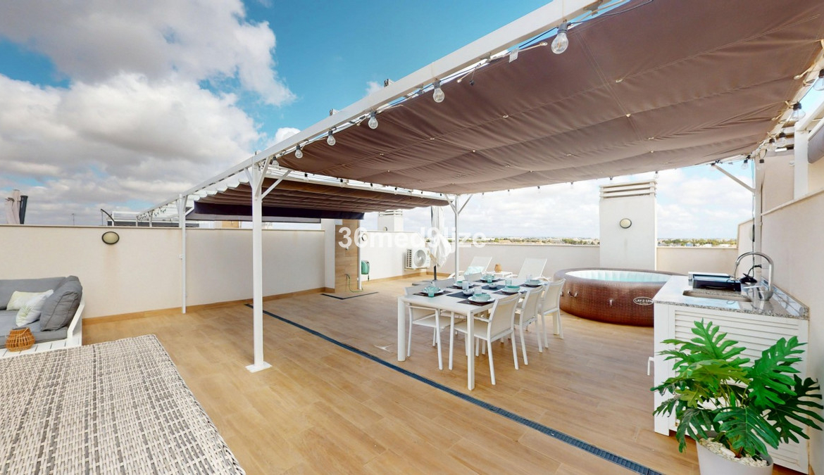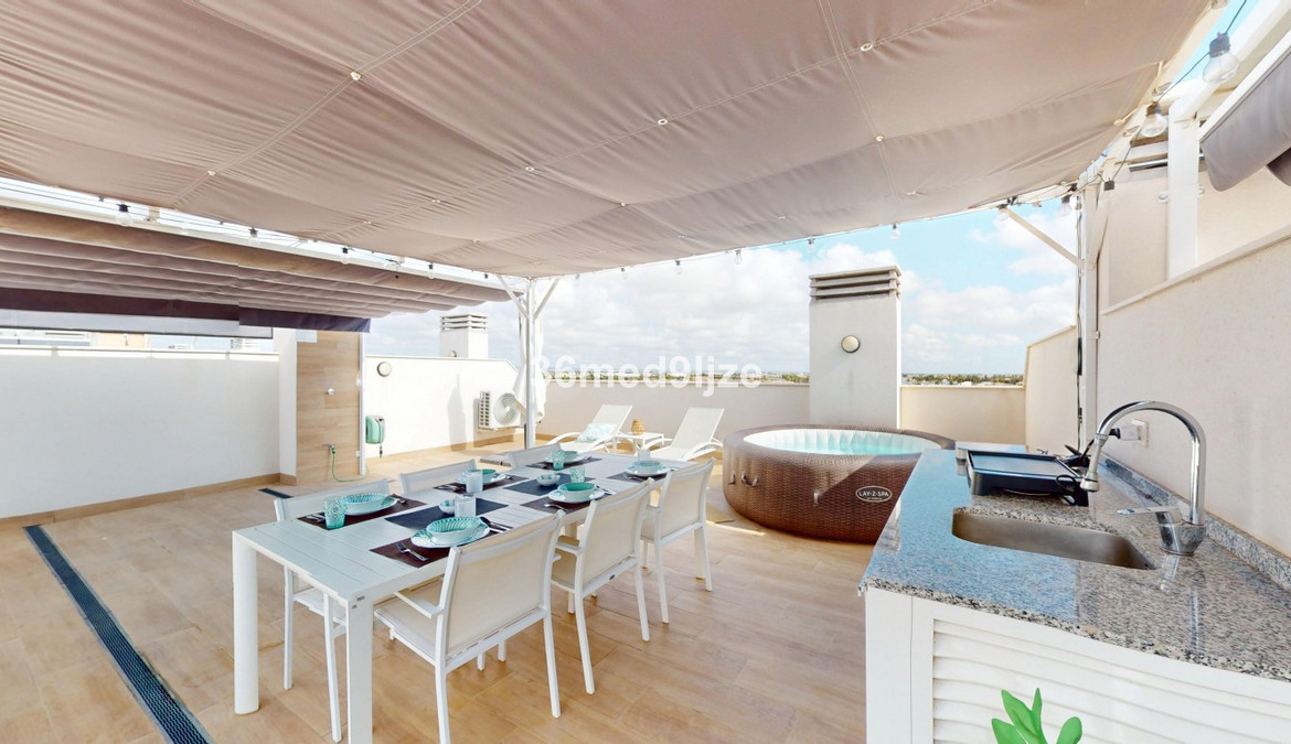 <p data-start=”1205″ data-end=”1624″>A private staircase leads to the impressive rooftop solarium — an exceptional outdoor living space equipped with a jacuzzi, outdoor kitchen, sun awning, dining area, lounge zone, and a comfortable seating corner. From here, you can enjoy breathtaking panoramic views over the Mar Menor, Roda Golf, and the charming town of Los Alcázares. Please note that the solarium is the only area that is not wheelchair accessible.</p>
