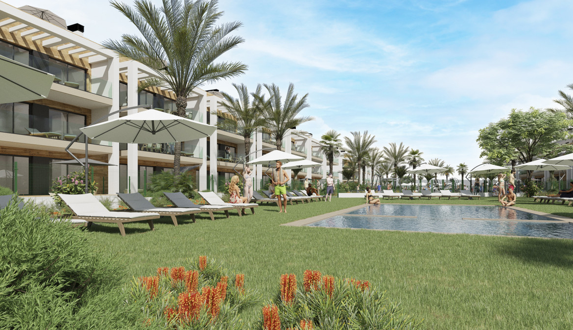 Our project will be divided into 8 blocks and has 244 apartments with 2 and 3 bedrooms, with modern design and finishes, located inside the La Serena golf course, in Los Alcazares. The ground floors have a beautiful garden, some with a private pool, and the second floors have a private solarium with access through the interior of the house.