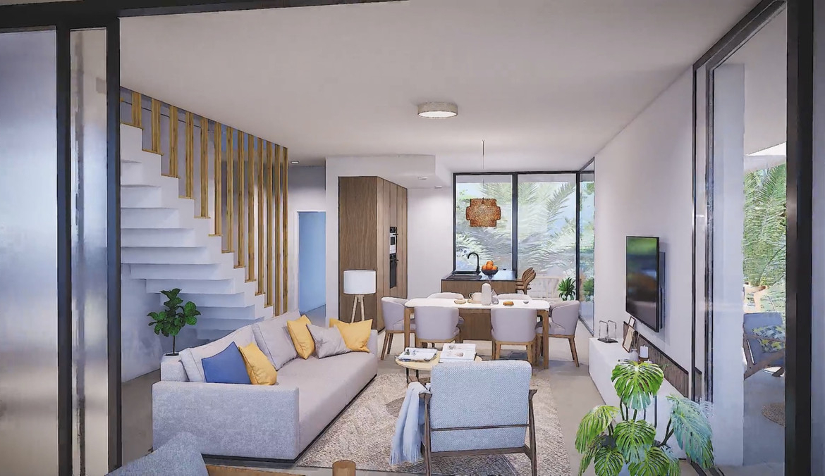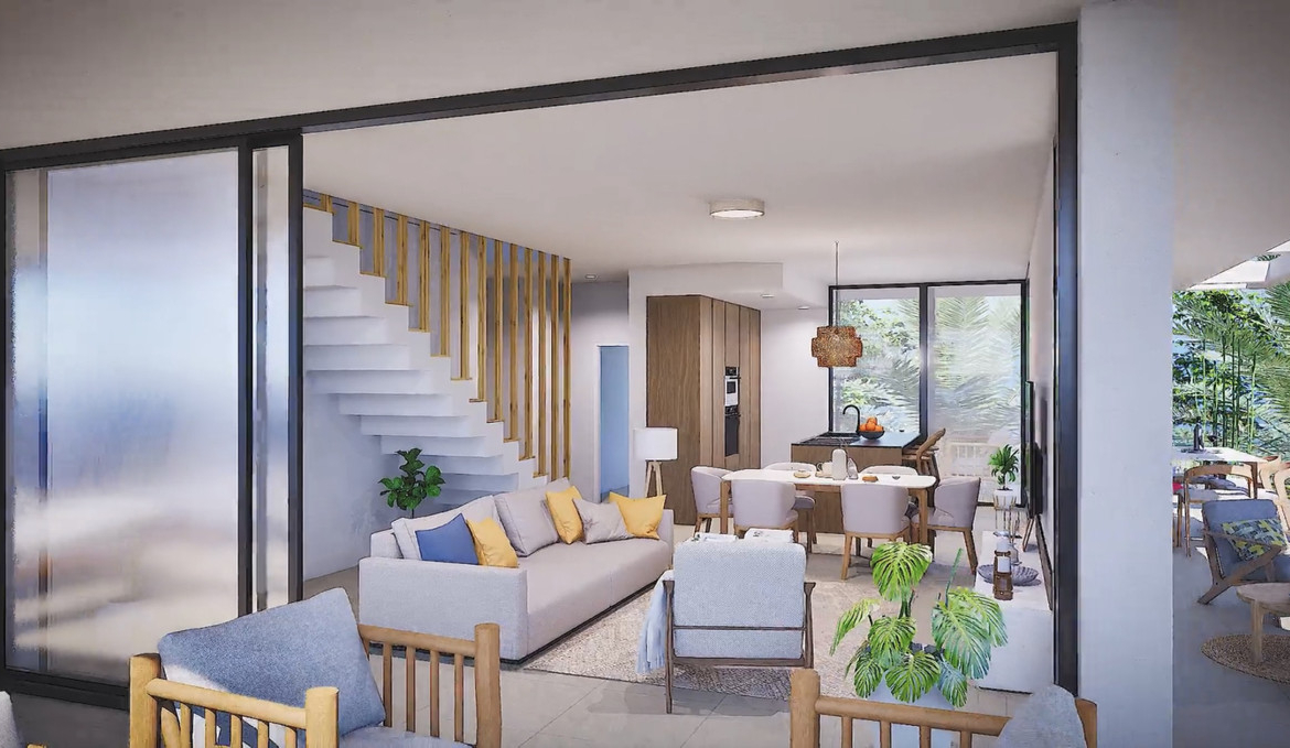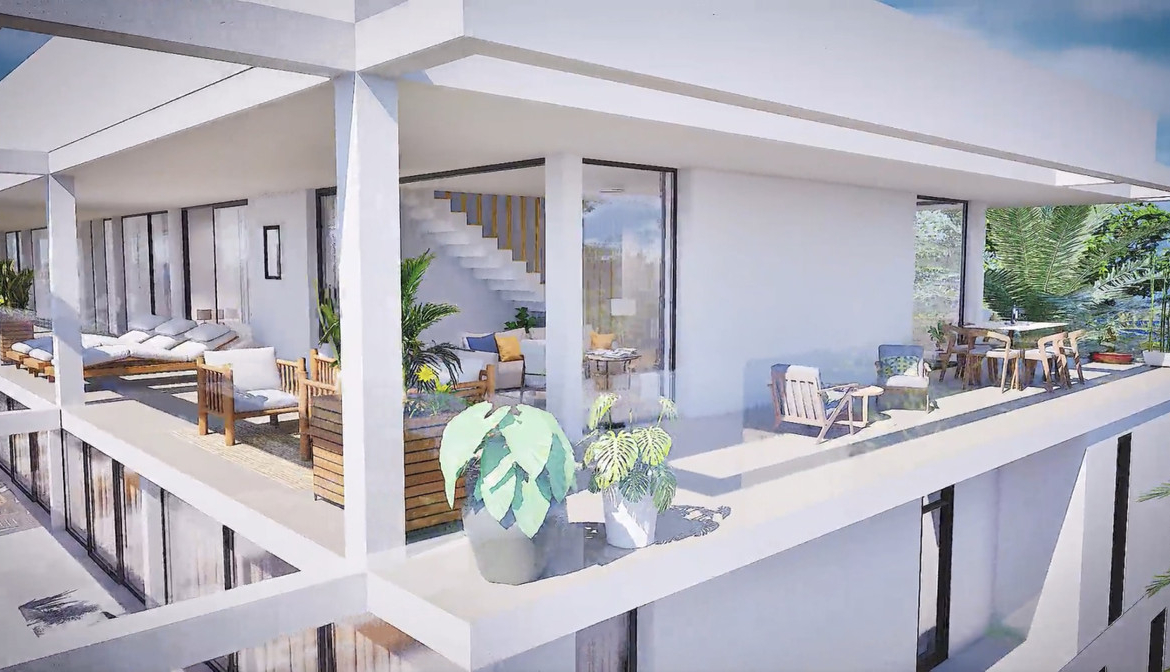 Modern style apartments, designed with open spaces and large windows, kitchen island, master bedroom with dressing room. Two bathrooms. The ground floors have big terraces facing to the pool whilst the phenthouse boast a solarium of more than 70m2. All homes are provided with a underground parking space for their vehicle and Storeroom.