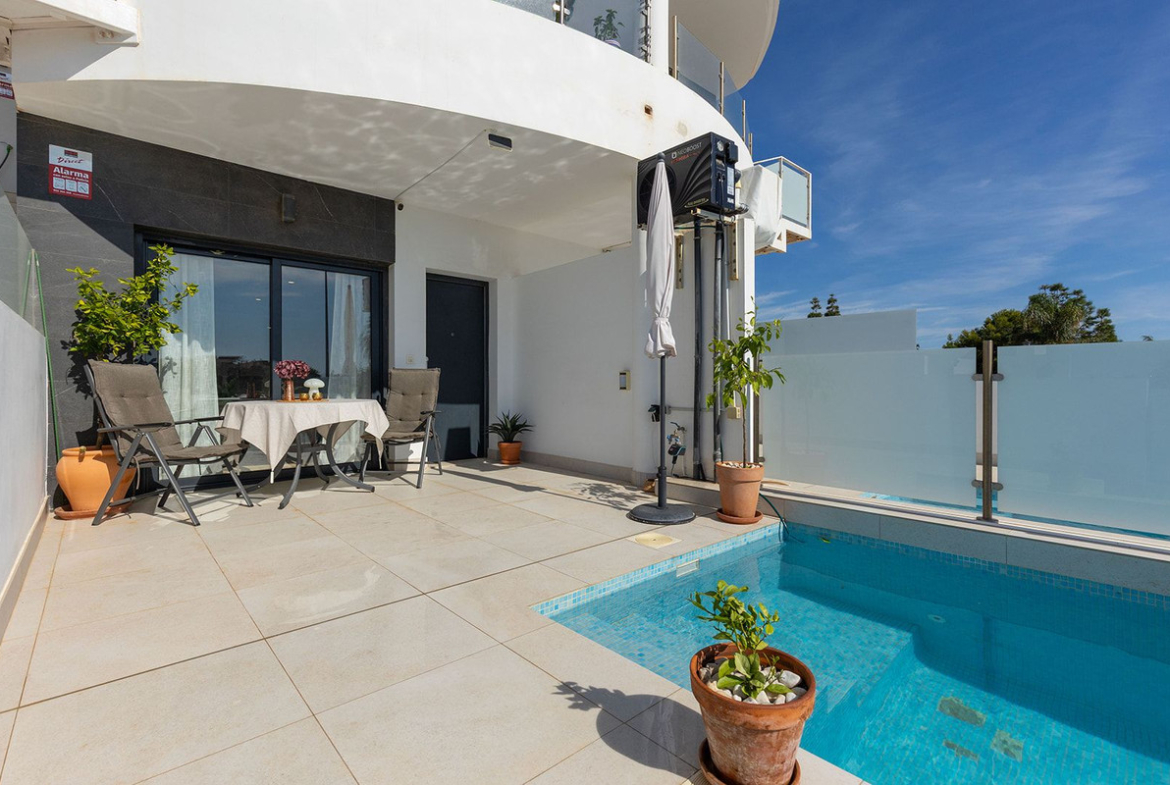 A really unique ground floor apartment with a private pool and two large terraces guaranteeing sun throughout the day. Located on the Serena Golf resort in Los Alcazares on the Mar Menor this apartment was built just a few years ago and has a modern, clean style both inside and out.