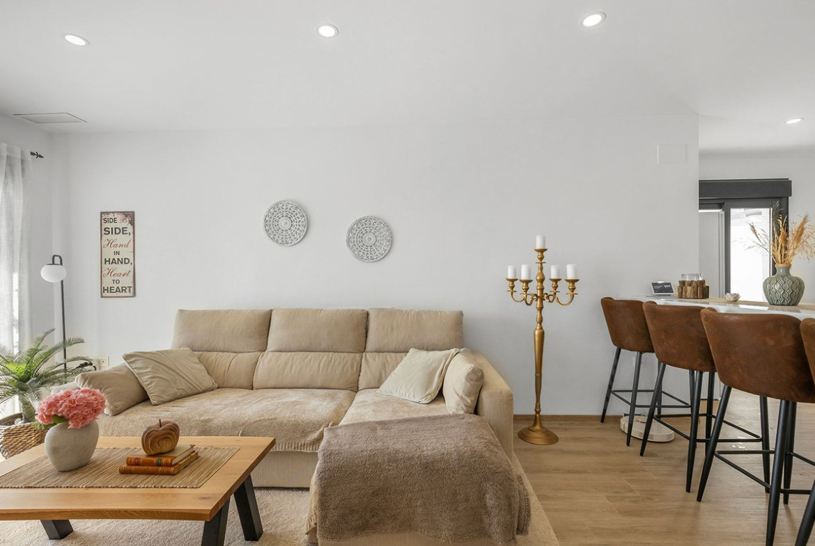 The property has a surprisingly spacious feel inside with a large living and dining room, adjoining kitchen with bar area and two bedrooms and two bathrooms. One of the bathrooms is ensuite to the master bedroom which also has direct access to the big back terrace. The back terrace wraps around the side of the apartment to the kitchen, from which there is another access meaning guests don't have to go through the master bedroom to access the terrace.