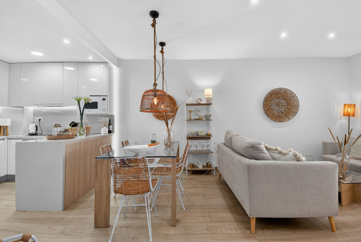 Inside, the apartment features a bright and airy living space with an open-plan kitchen, thoughtfully designed for both comfort and entertaining.