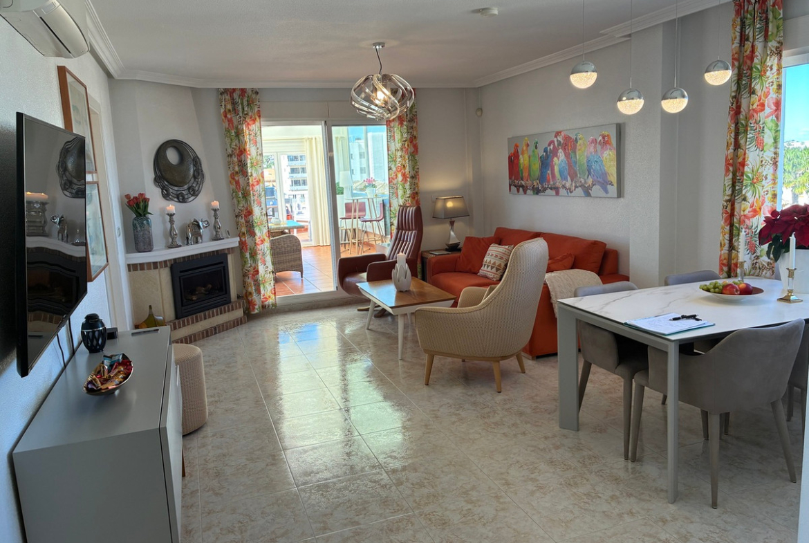 Luxury Sun-Drenched Penthouse with Exceptional Outdoor Living.This stunning penthouse apartment offers an abundance of sun-soaked outdoor space and truly must be seen to be appreciated. Designed for year-round enjoyment, it features a beautiful bonus sunroom — perfect for making the most of the Spanish climate in every season.Comfort is guaranteed throughout the year with air conditioning for the summer months, and underfloor heating plus a cosy fireplace for the winter. The building also benefits from lift access for added convenience.Residents enjoy outstanding communal facilities, including an outdoor swimming pool, a heated indoor pool, and a wellness area complete with sauna and steam room — bringing a true spa-like experience to your doorstep.Inside, the property boasts: • A spacious and bright living and dining area • A large, fully equipped kitchen with all white goods included • Two generous double bedrooms with built-in wardrobes • Two full-size bathroomsThe apartment is beautifully decorated and sold with high-quality furniture throughout. As an added bonus, two electric bikes and golf equipment are included. There is also the option to purchase a car alongside the property.Ideally located close to a wide range of amenities, including the award-winning Orihuela Costa beaches and the renowned Zenia Boulevard shopping centre, this penthouse offers both convenience and lifestyle.Whether you’re searching for a permanent residence or the perfect holiday retreat, this exceptional home ticks every box.Contact us today to arrange your viewing — this is one not to miss.