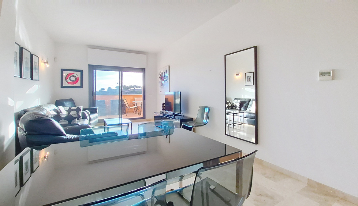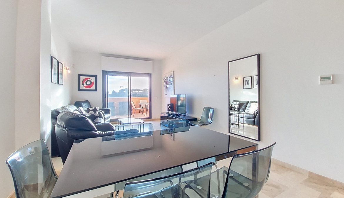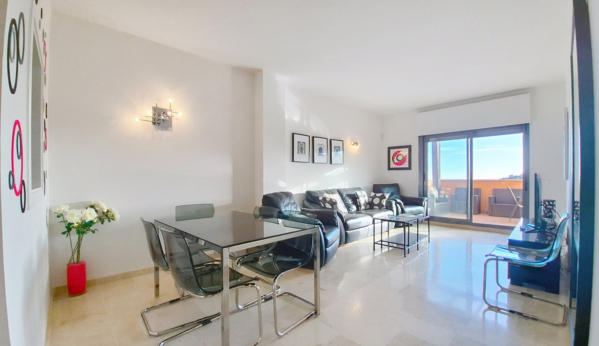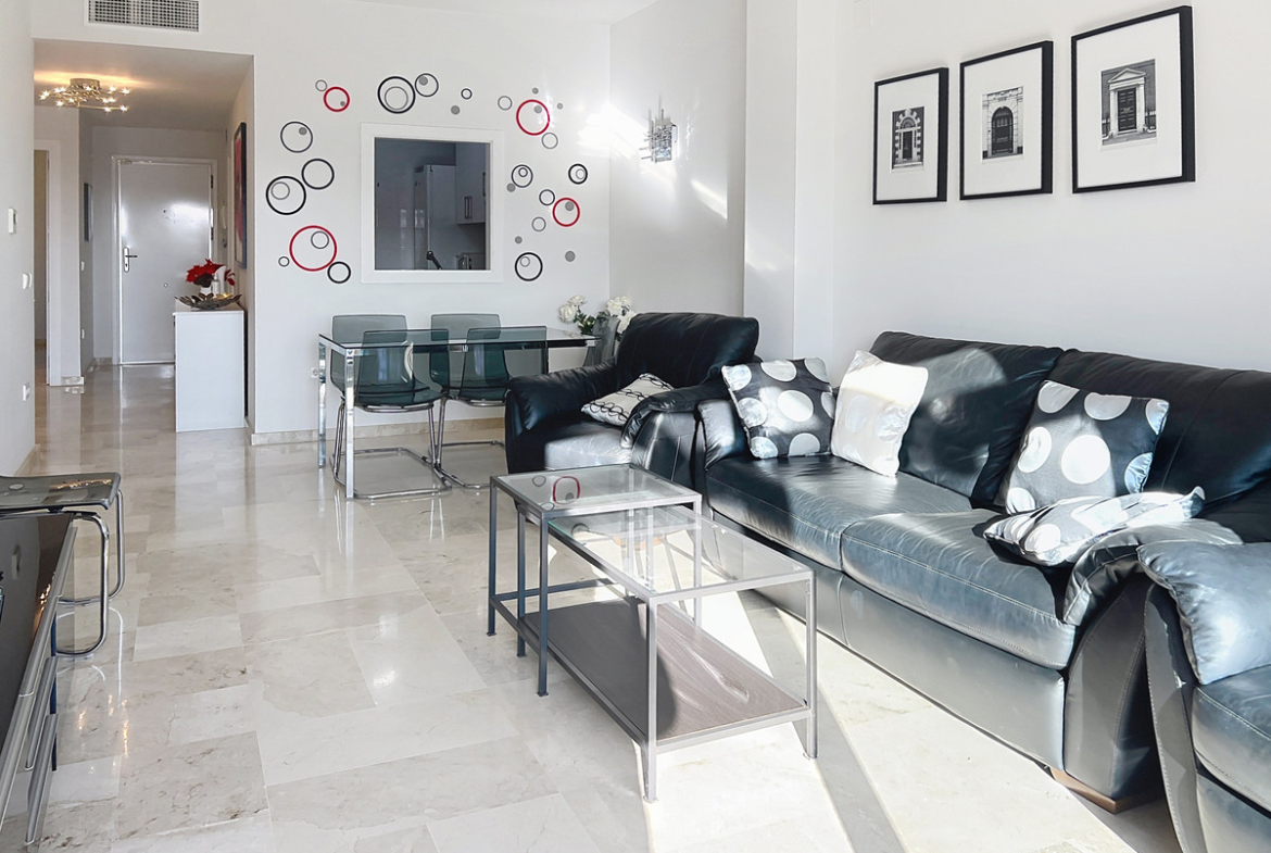 The apartment features a fully equipped kitchen, reversible air conditioning, and a beautiful terrace of approximately 20 m² with stunning views of the sea and the Rock of Gibraltar.