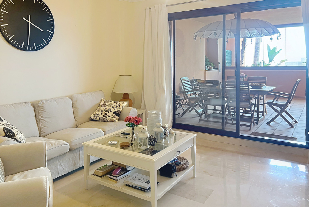 This elevated ground-floor apartment offers spacious living areas, 2 bedrooms and 2 high-quality beige marble bathrooms, and a fully equipped kitchen that opens onto the living room through a serving hatch.