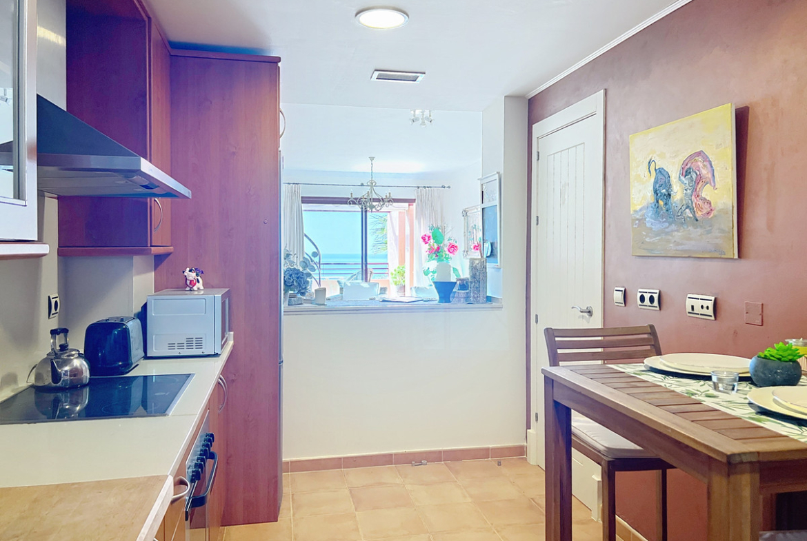 This beautiful penthouse offers 2 bedrooms and 2 bathrooms, with panoramic sea views from the living room, master bedroom, terrace, solarium, and even from the kitchen. The kitchen is fully equipped and features a serving hatch that connects to the living room, allowing you to cook while enjoying the stunning sea views and spending time with your family.