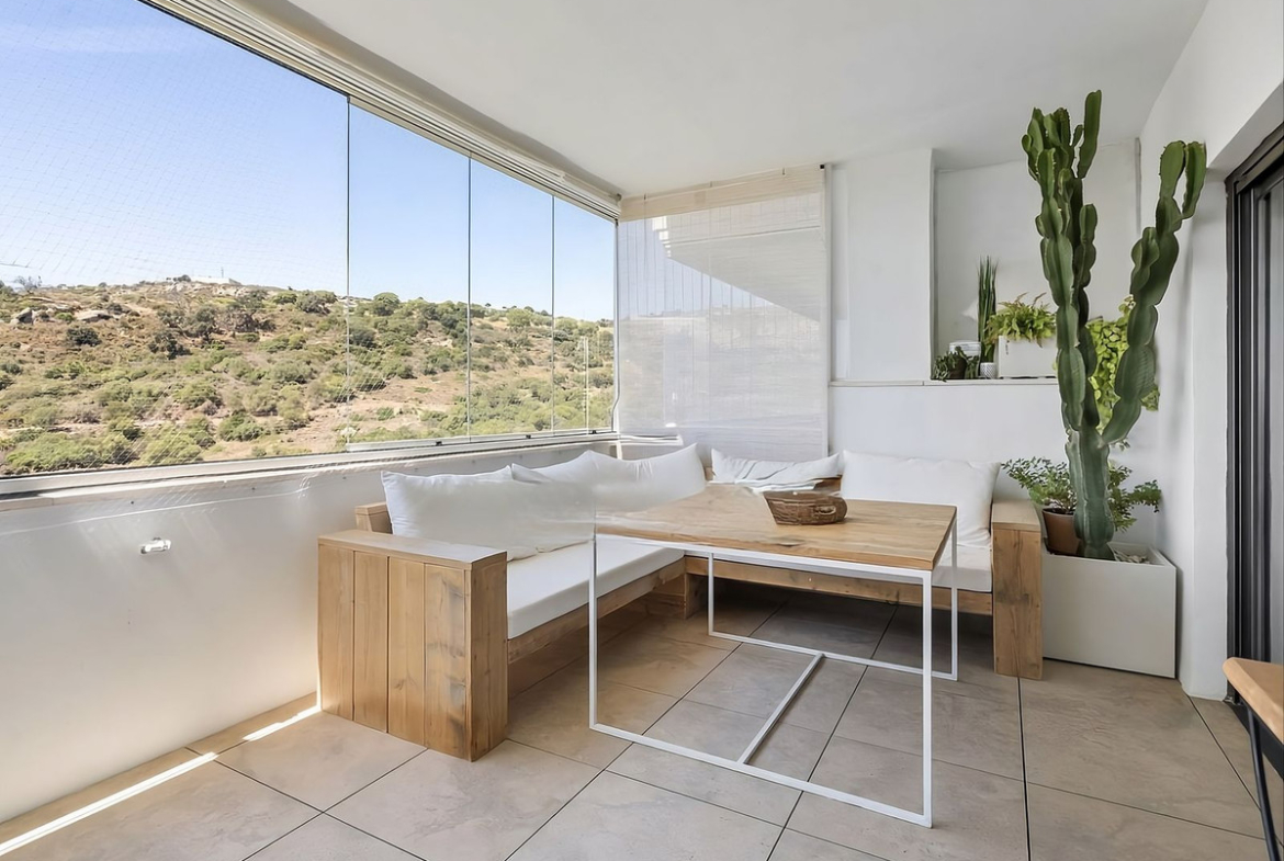 The spacious living room opens onto a southwest-facing terrace, transformed into a true additional living space thanks to the “cortinas de cristal” — frameless glass curtains. These adjustable panels allow you to enjoy the terrace year-round: fully open in summer, partially or fully closed depending on the season.