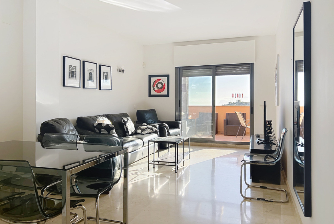The apartment features a fully equipped kitchen, reversible air conditioning, and a beautiful terrace of approximately 20 m² with stunning views of the sea and the Rock of Gibraltar.