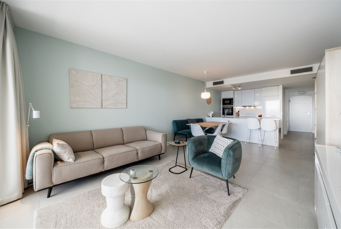 The apartment is filled with natural light and offers a seamless indoor outdoor flow. The open plan living area combines a stylish lounge, dining space, Murphy bed and fully equipped kitchen with integrated appliances, all opening onto a generous covered terrace. From here, you can enjoy the sea views, with both shaded and sunny areas designed for year round enjoyment. The outdoor space is further enhanced by a private garden with artificial grass, planting, and an automatic irrigation system, creating a peaceful setting for relaxing or entertaining.