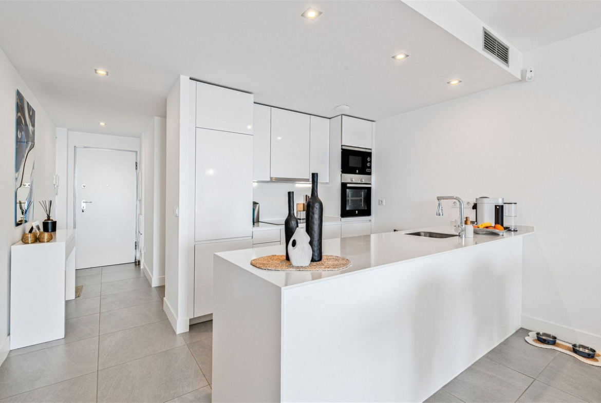 Finished to a high standard, the apartment features floor-to-ceiling windows with fitted mosquito nets , modular fitted wardrobes, and bathrooms with top-brand tiling, thermostatic showers, and quality fittings. The kitchen is fully fitted with floor-to-ceiling cabinetry, quartz worktops, and integrated appliances, including induction hob, oven, microwave, fridge, dishwasher, washing machine, and dryer. Centralised air conditioning and advanced acoustic and thermal insulation.
