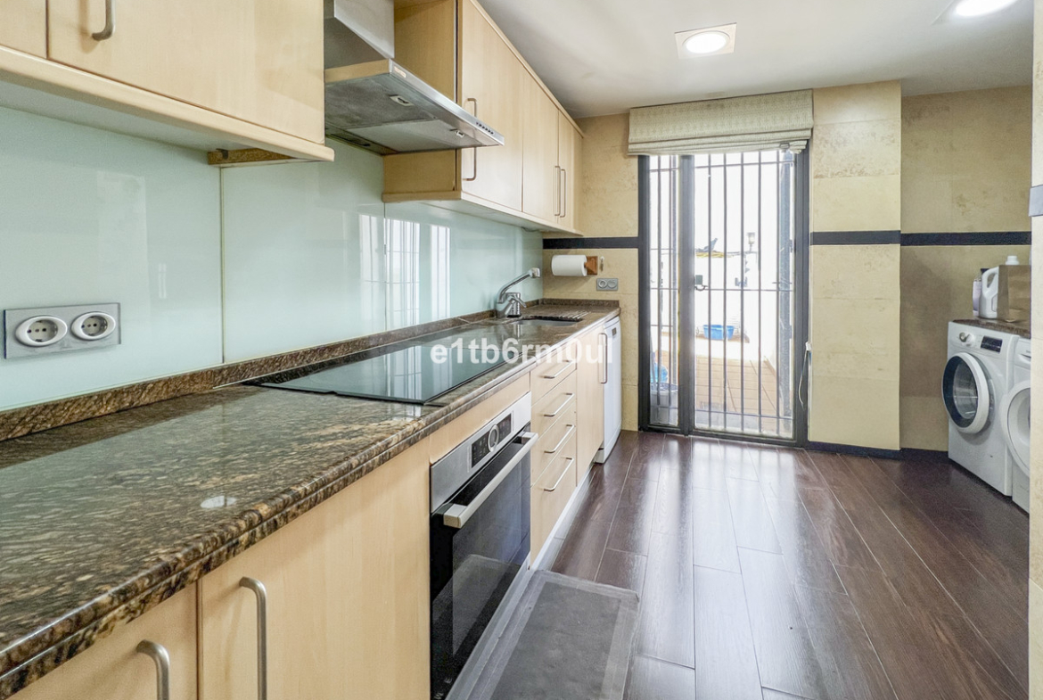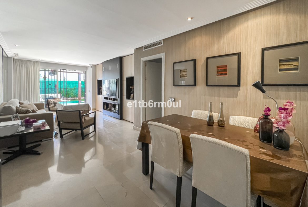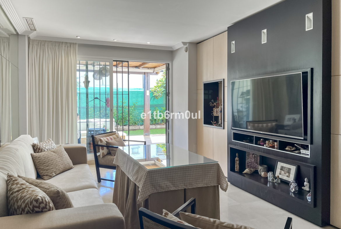 Ground floor apartment in Xarblanca with exceptional private outdoor space in a gated community close to amenities and Marbella town centre with great transport links. Open plan living, dining room and large fully fitted kitchen with direct access onto the terrace area. Large outdoor space, 95m2, lots of room for sunbathing, BBQ, dining alfresco and entertaining. Perfect safe space for kids to play, there is also direct access to the street from the terrace. Two bedrooms and two bathrooms, the master bedroom is ensuite. Both bathrooms have been recently refurbished. Underground car parking space included. The apartment is air-conditioned, hot and cold. The community has a communal swimming pool.