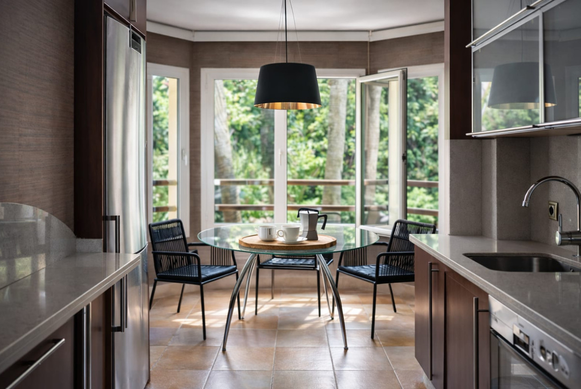Enjoy the elegance of travertine marble walls on the terrace and a fully equipped kitchen with a cozy breakfast nook. The living and dining area connects seamlessly with a covered terrace, ideal for entertaining guests or relaxing while enjoying the breathtaking views.