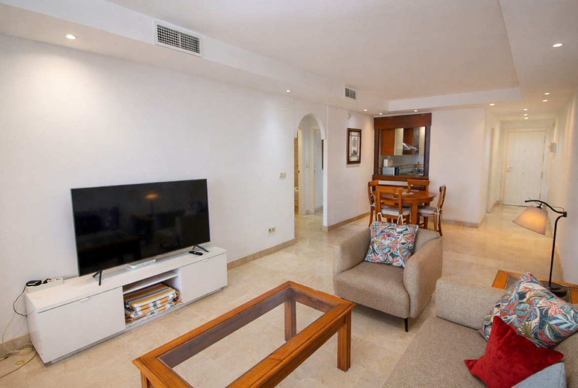 Located in the prestigious Golden Mile of Marbella, this beautifully presented two-bedroom, two-bathroom apartment offers a luxurious lifestyle in one of the Costa del Sol’s most sought-after locations. Set within a secure gated urbanisation with 24-hour security, the property is just a short stroll from the beach and moments from the centres of Marbella and Puerto Banús, as well as top-rated restaurants, international schools, and all essential amenities. Built in 2001, the apartment offers a generous 124 m² of built space and benefits from a south-east orientation with good sea views. The spacious living and dining area opens directly onto the terrace, which is also accessible from the master bedroom. Accommodation comprises two double bedrooms with fitted wardrobes and two bathrooms, including an en-suite to the master bedroom. Finishes include marble flooring throughout, air conditioning, and a fully fitted kitchen. The property is sold with underground parking and a private storeroom. The apartment is set within immaculate communal gardens and residents enjoy access to a large swimming pool, gymnasium, sauna, and jacuzzi.