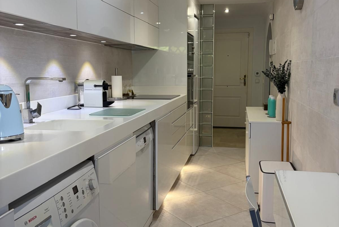 The apartment features a cosy entrance hall leading to a modern, fully fitted kitchen with top-of-the-range appliances (Bosch and Smeg). The spacious and bright living-dining room provides an ideal space for relaxation and socialising.