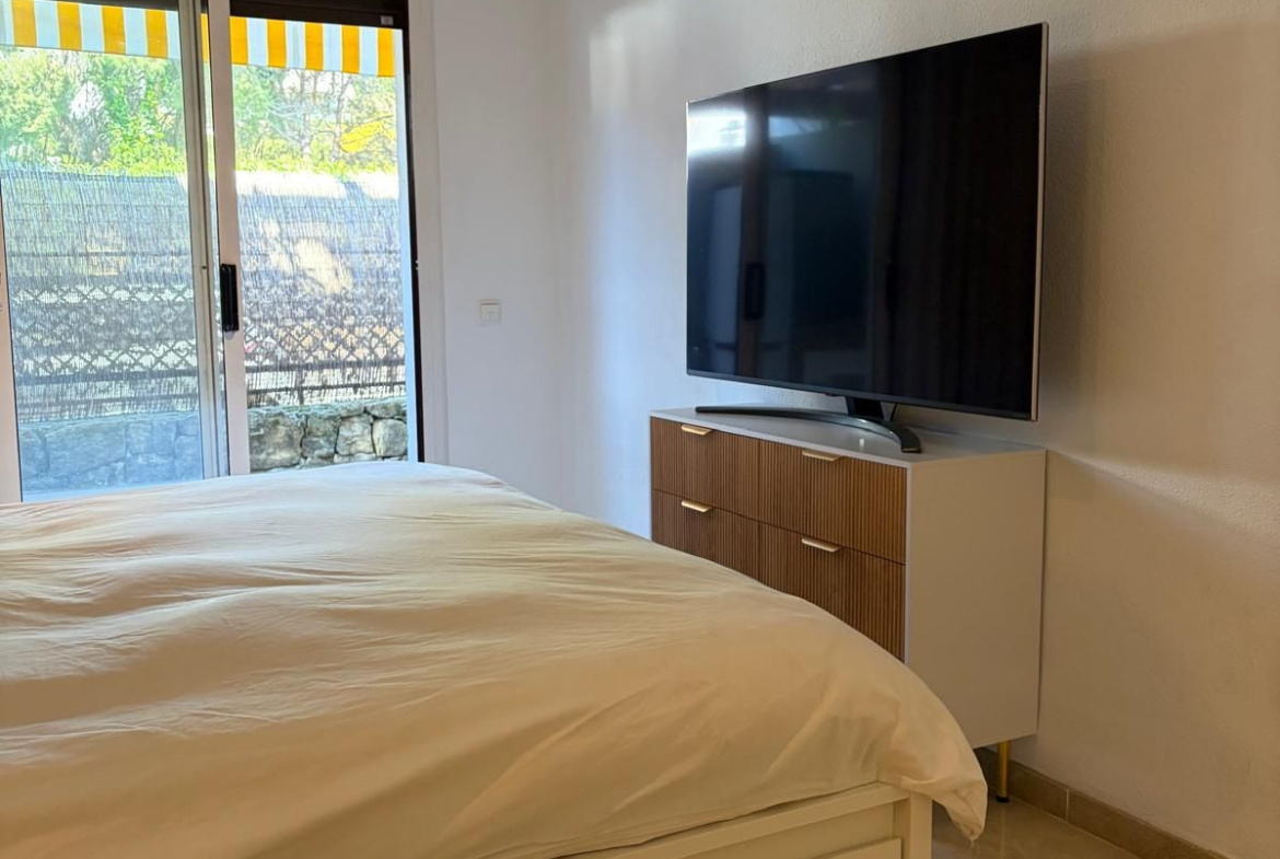 It comprises two bedrooms with fitted wardrobes and two full bathrooms, one of which is en suite. The property is complemented by a magnificent 44 m² terrace, with direct access from the kitchen, living room and both bedrooms, perfect for enjoying the Mediterranean climate.