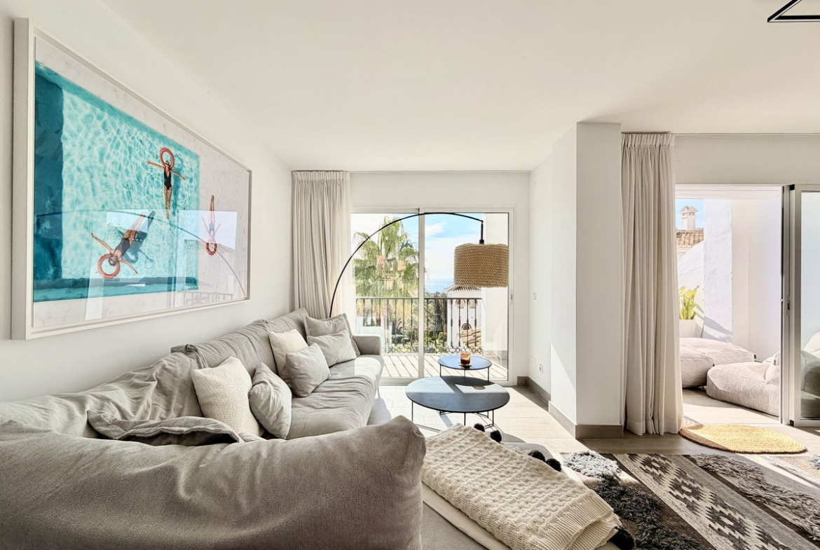 Indulge in refined coastal living in this elegant, newly renovated penthouse, set within a peaceful Andalusian community in the prestigious Marbella East, Las Chapas. Designed for comfort and sophistication, this residence offers breathtaking sea and mountain views, generous outdoor spaces, and a serene atmosphere just minutes from Marbella’s finest beaches.