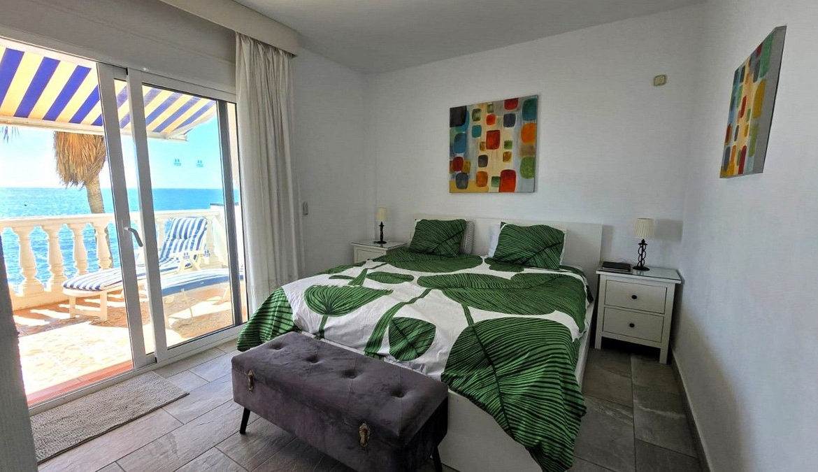 The master bedroom features floor-to-ceiling Venetian-style double-pane windows, filling the space with natural light and offering panoramic sea views. Large enough to accommodate a king-size bed, it also includes built-in wardrobes and an en-suite bathroom.