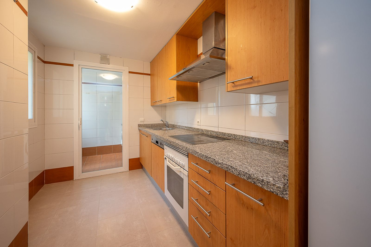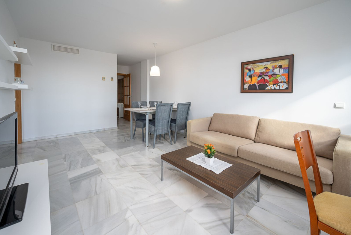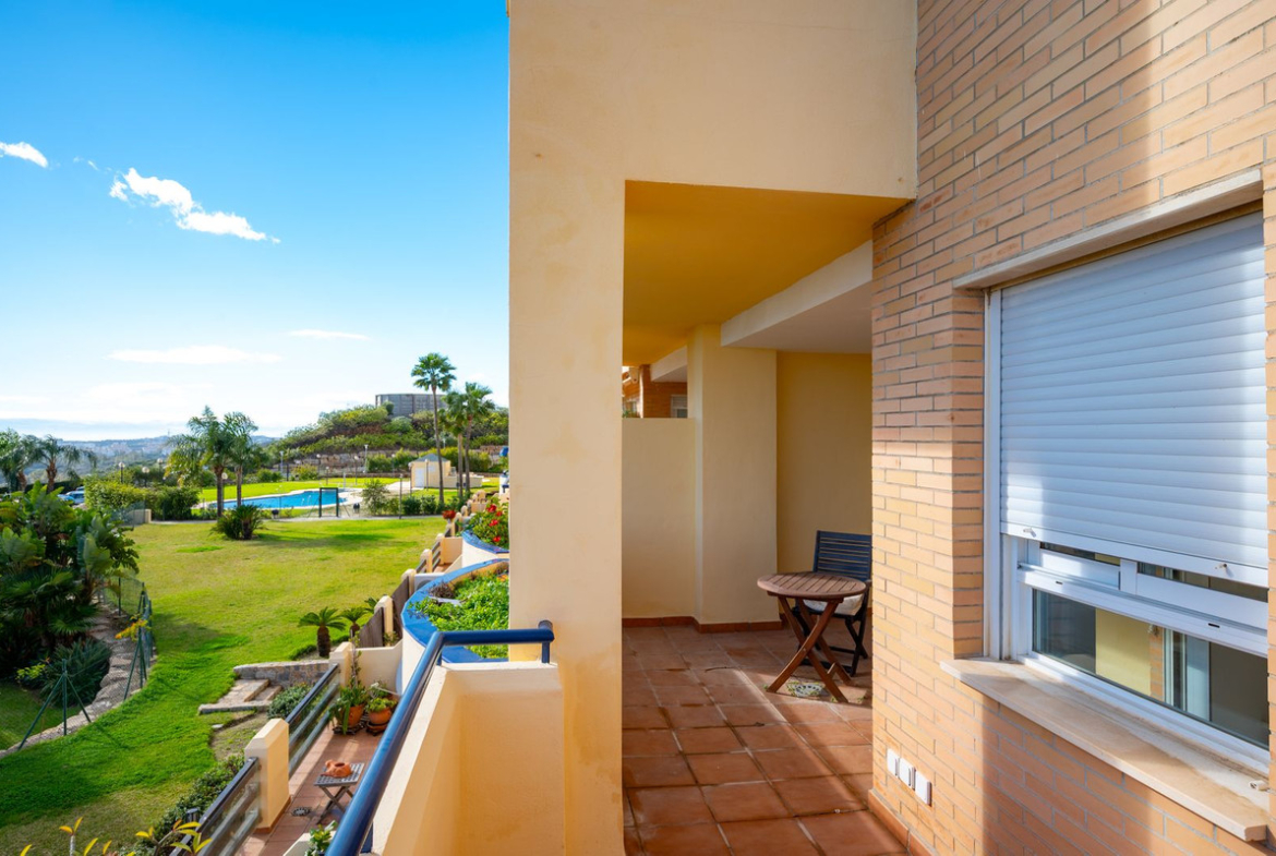 This spacious and very bright apartment is located in the upper part of El Chaparral in a gated community with a video entry system, with views of the racetrack and the sea. In a quiet area yet just minutes from Fuengirola and Cala de Mijas, this apartment is sold fully furnished and offers spacious rooms, including a separate kitchen with utility room, a living-dining room with access to the terrace, two double bedrooms, two full bathrooms, one ensuite, a terrace with views, and a parking space and storage room included. The community also has guest parking, a swimming pool, sauna, gym and gardens. Don't miss this opportunity!