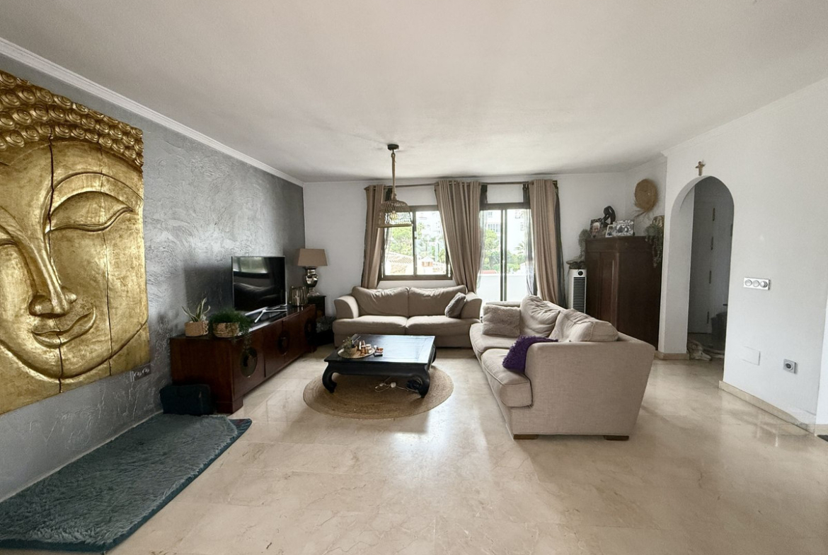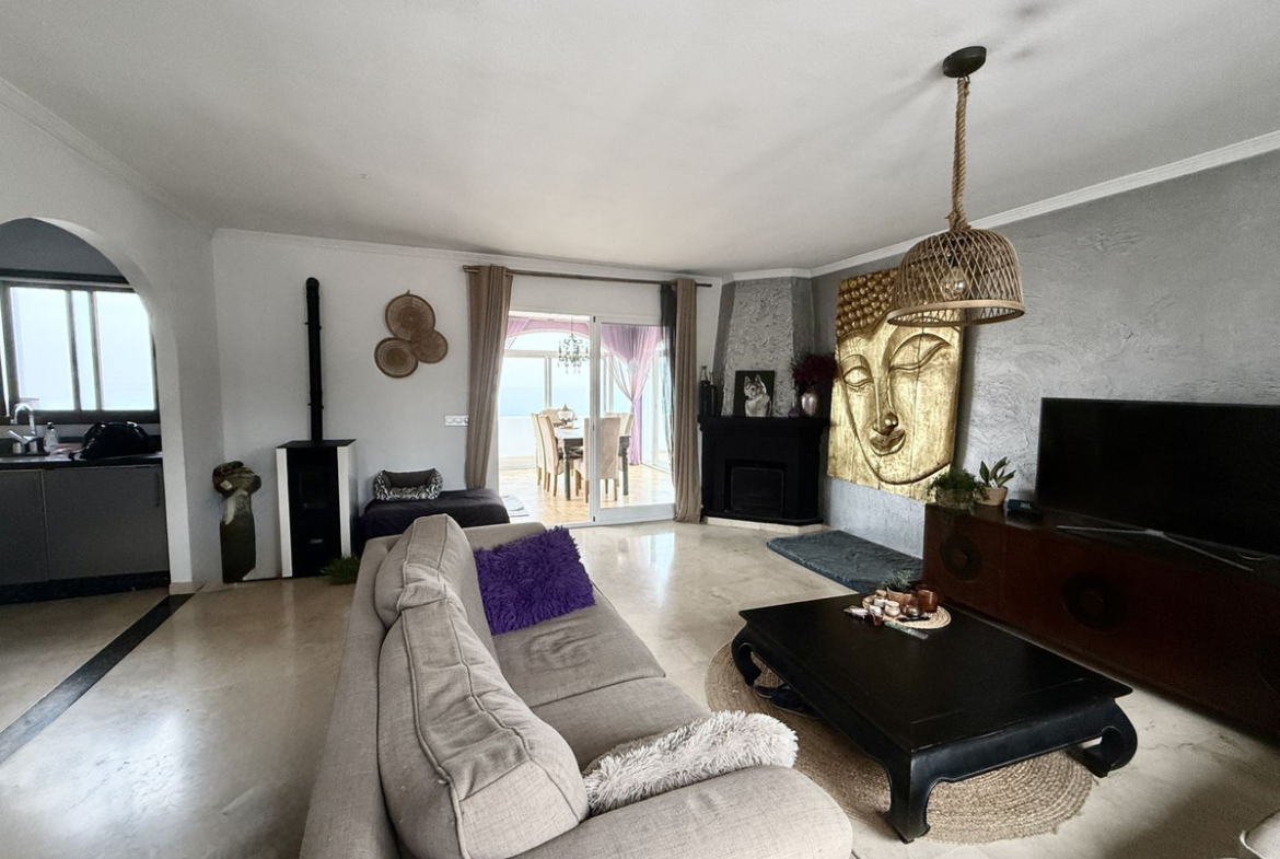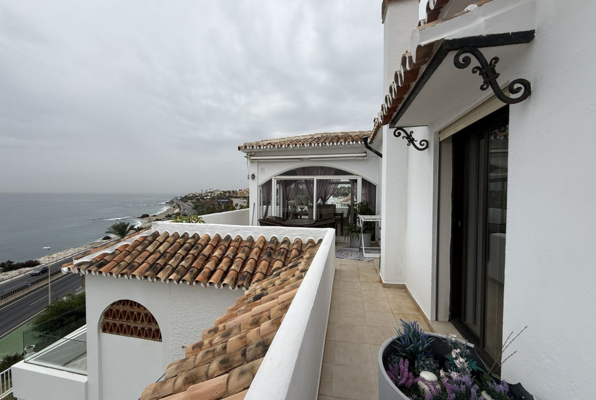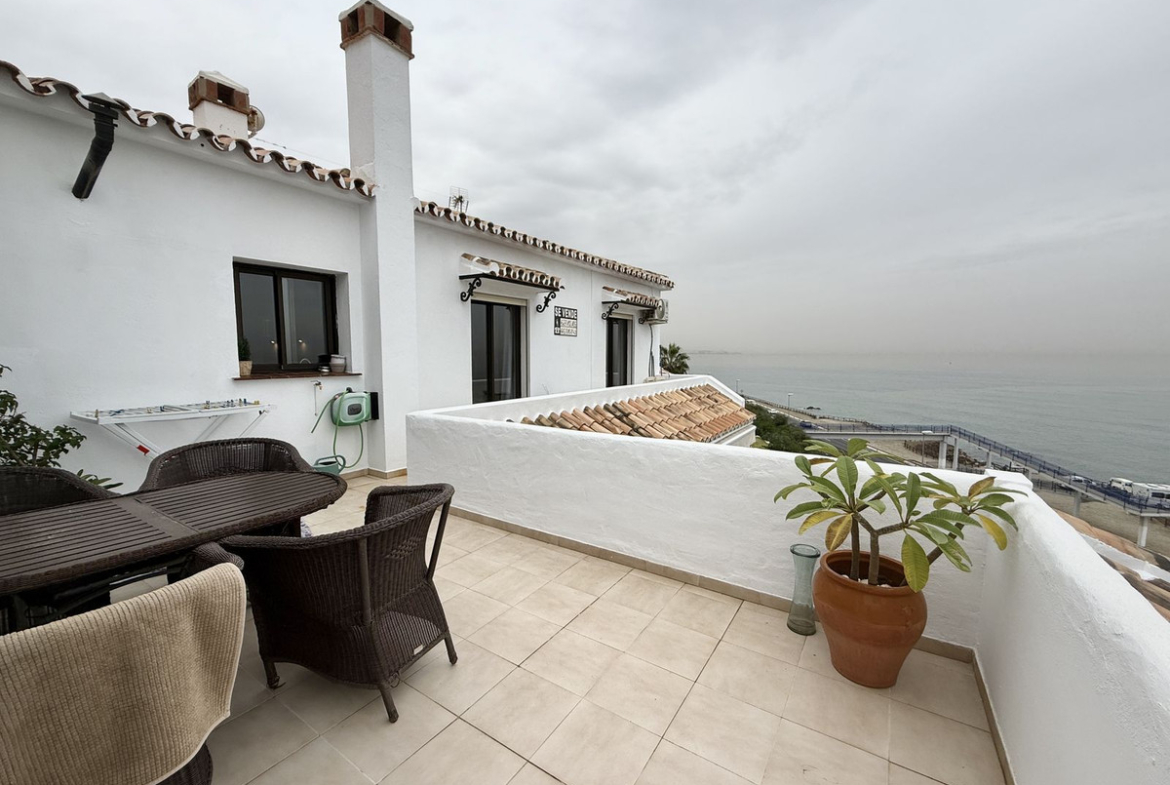 Penthouse apartment with the most stunning, panoramic sea views!!! Located within just a few minutes¨walk to the beach and just a few minutes¨drive to Fuengirola and La Cala de Mijas, this trully superb property is a rare find! The property comprises of a spacious lounge/dining room with pelllet burning fireplace, open plan modern kitchen, one double bedroom with bathroom plus the master bedroom with ensuite bathroom. Both bedrooms have patio door access to the terrace and built in wardrobes. Via patio doors from the lounge, is a stunning glass conservatory/sun lounge, used by the current owner as the dining room. The terrace of the property extends the full length of the apartment and to the side, being a corner property, and offers south facing full frontal and lateral uninterrupted sea views. The community is immaculately maintained, with gated access to the communal carparking area. There is a large swimming pool with sunbathing areas. Local amenities can be walked to also, including bars and restaurants, supermarket, bakery etc.