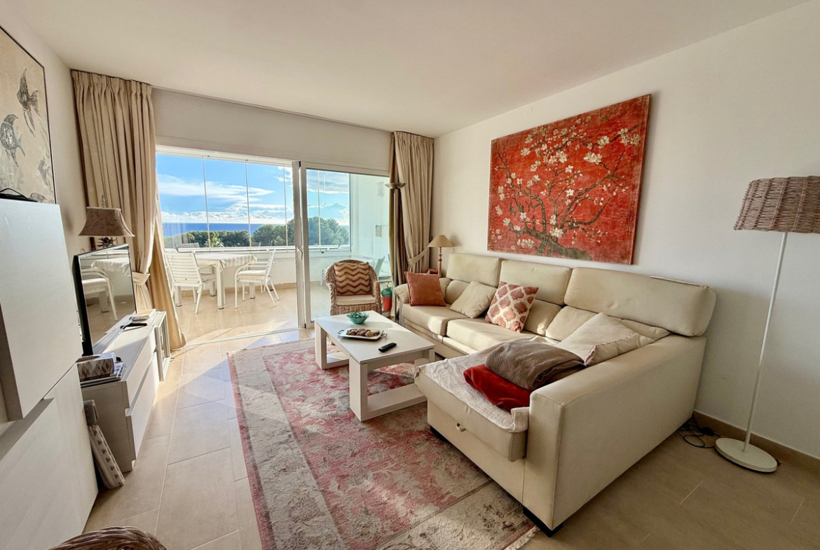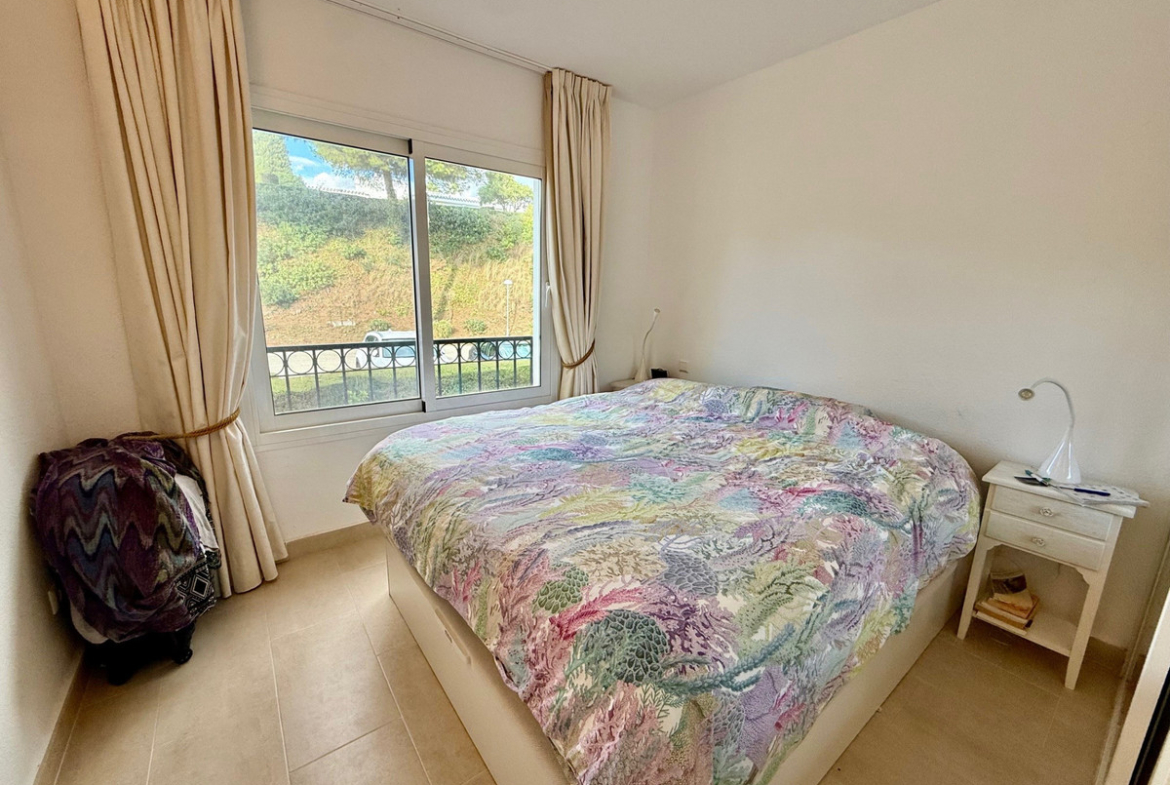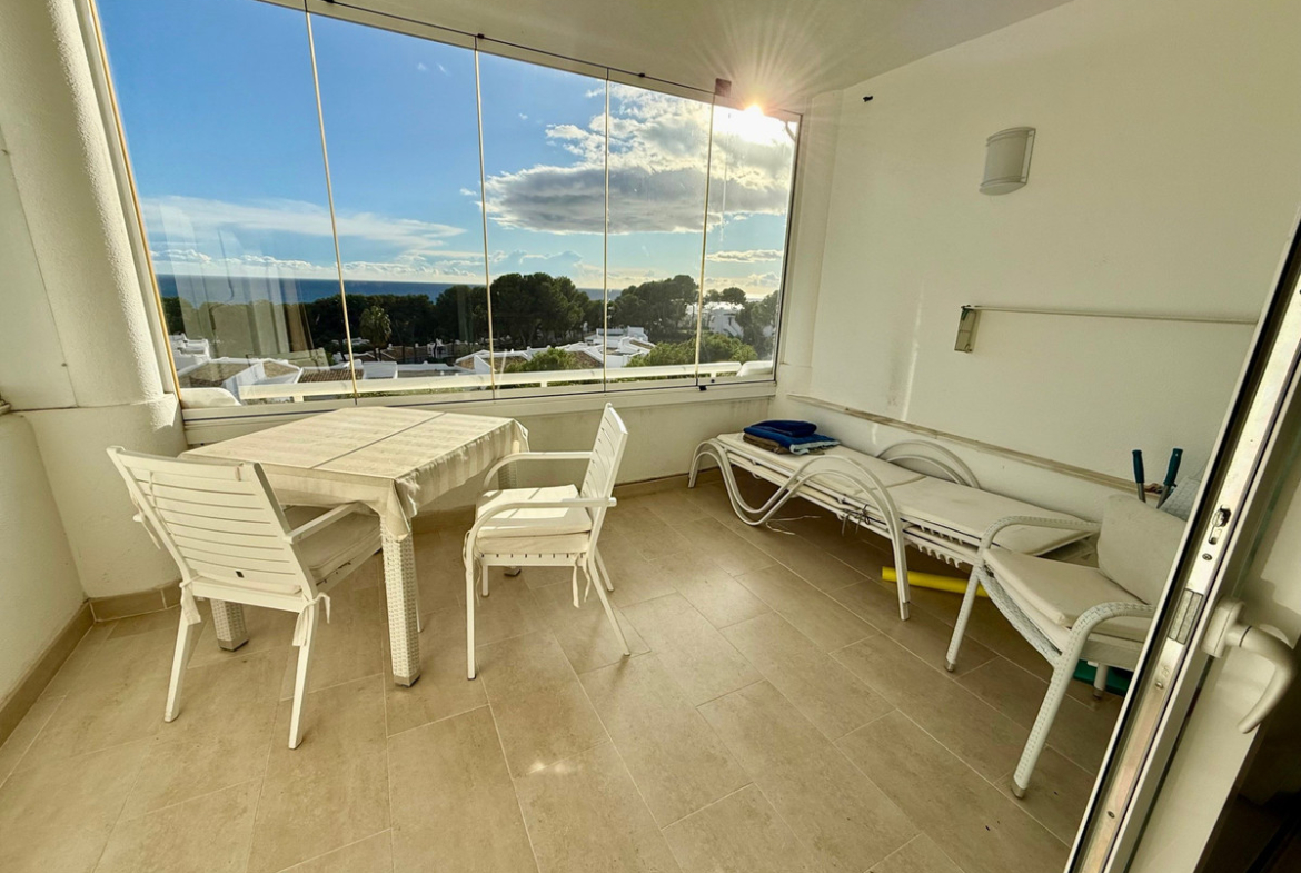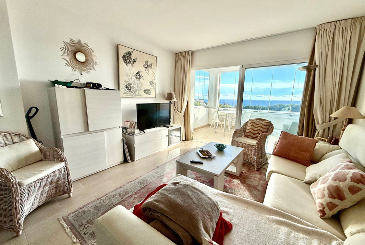 This apartment in Miraflores, Mijas Costa, convinces with its privileged location with magnificent views of the sea, the landscape and the well maintained communal garden and pool. On 80 m2, the apartment offers two cozy bedrooms, a modern bathroom and an open-plan living/dining area, terrace with glazing, which allow a lot of daylight and sea view. The complex includes a beautiful garden, a spacious pool area and parking right in front of the entrance.