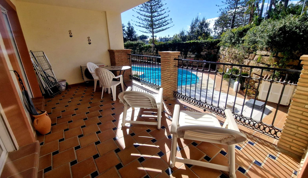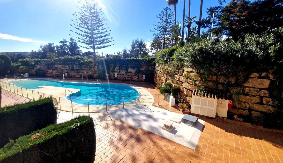 On the golf and with a beautiful environment, fantastic sunny and bright apartment with a large west facing terrace overlooking the pool and sun until the sunset. This property offers 2 bedrooms with fitted wardrobes, both with access to the terrace and the master one is huge with en suite marble bathroom. Completely fully equipped kitchen with new white goods opened to the lounge. This property has A/C, marble bathrooms and floors and a very large underground parking included in theprice. It is set in a well known urbanisationin Mijas Golf just ten minutes driving to the Fungirola beaches. Bus stop near by also. Ideal for golfers or rentals! We highly recommend the viewing, you will fell in love with.