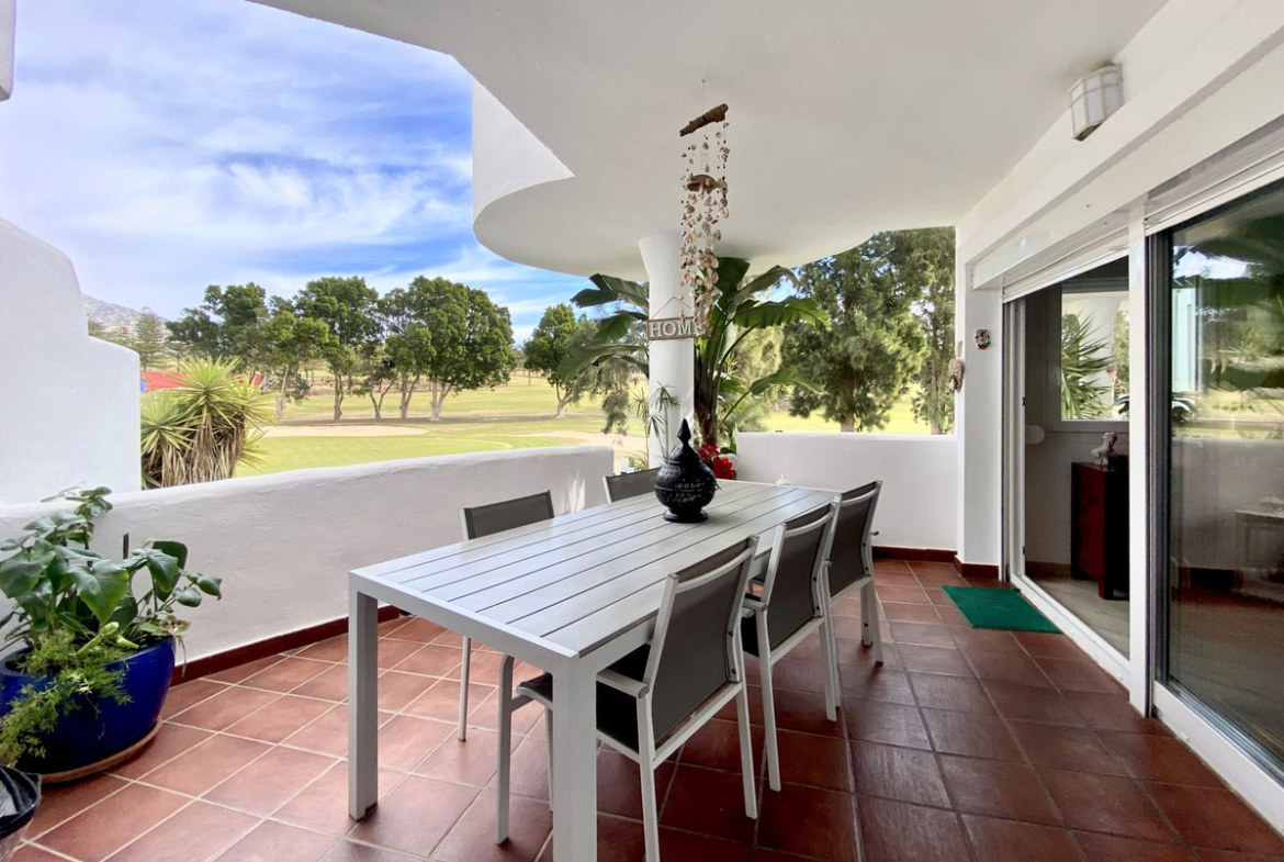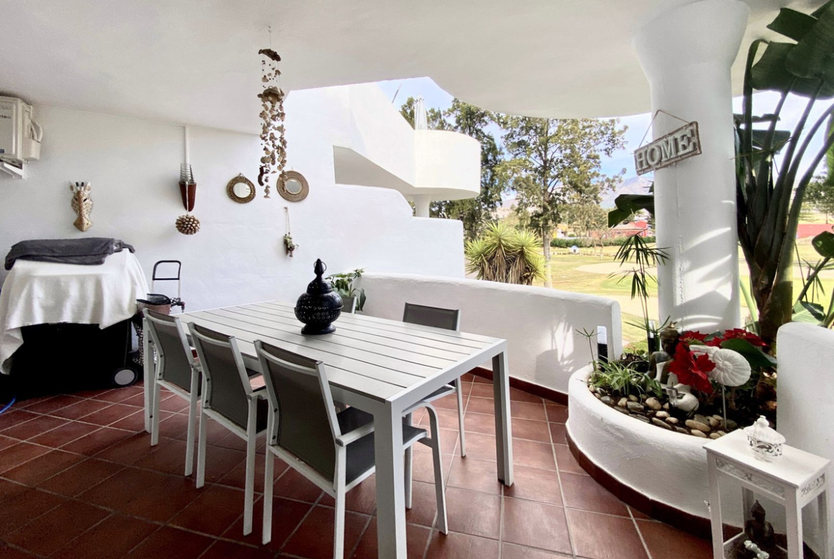 STUNNING ULTRA LUXURY/MODERN APARTMENT in front line Mijas Golf location. Refurbished to the very highest of standards. The property consists of a spacious lounge/dining room, modern fully fitted kitchen, master bedroom with en-suite bathroom, another double bedroom with walk in wardrobe (formerly second bathroom, but with all plumbing still in place to be made into a bathroom again easily), a small southwest terrace overlooking the immaculately kept communal gardens and swimming pools and a large covered north east terrace overlooking the golf course and mountains.