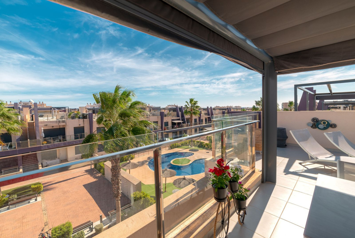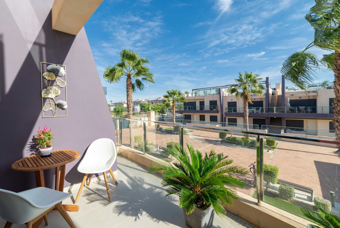 From the home you reach a large balcony with a view of the well-kept pool area and the nice courtyard – a nice place for morning coffee in the sun or a quiet moment in the shade in the afternoon.