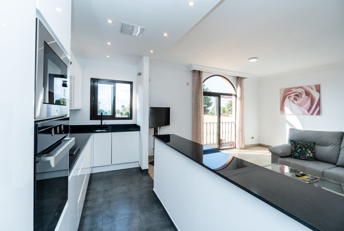 The apartment features a bright and airy open-plan living and dining area, two generously sized bedrooms with fitted wardrobes and air conditioning throughout, and not just one but three private terraces—including a stunning large rooftop solarium, perfect for sunbathing, entertaining, or enjoying beautiful views of the Mediterranean climate.