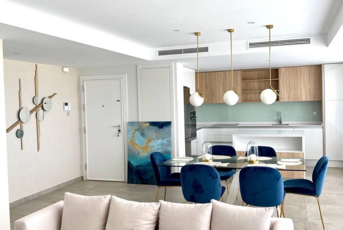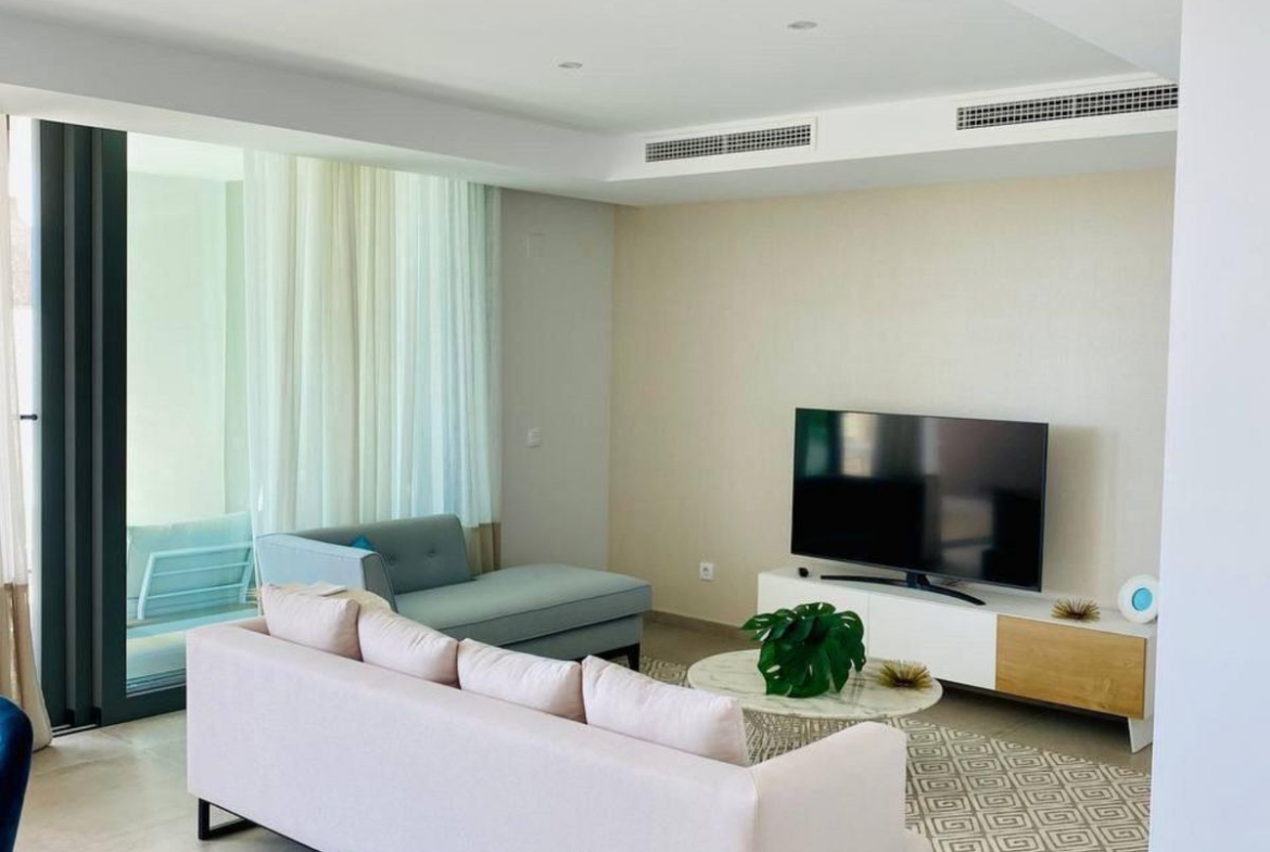 The residences, constructed in 2019, provide open-concept living areas with expansive terraces, enhancing natural light and offering views of the Mediterranean Sea and the adjacent mountains.