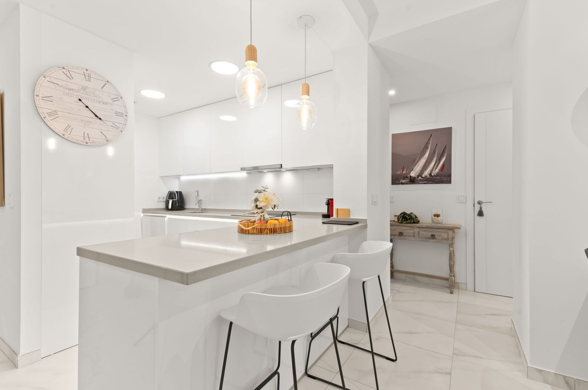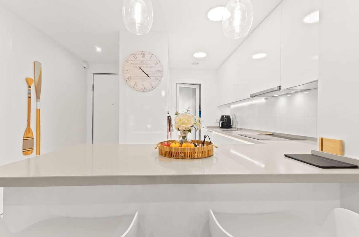 The property features a modern and functional open-plan layout, combining kitchen and living area. The fully equipped kitchen has direct access to an east-facing terrace, perfect for enjoying sunny mornings.
