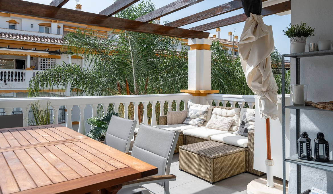 The apartment has been recently updated to modern standards, providing a sleek and contemporary living space. The community offers excellent amenities, including a large pool area, Padel courts, and an on-site restaurant, ensuring both comfort and convenience. Additionally, the location is unbeatable, with just a short stroll to the beach, shops, and local attractions. This penthouse is ideal for those seeking a stylish, sun-filled retreat in a vibrant and well-serviced neighborhood.