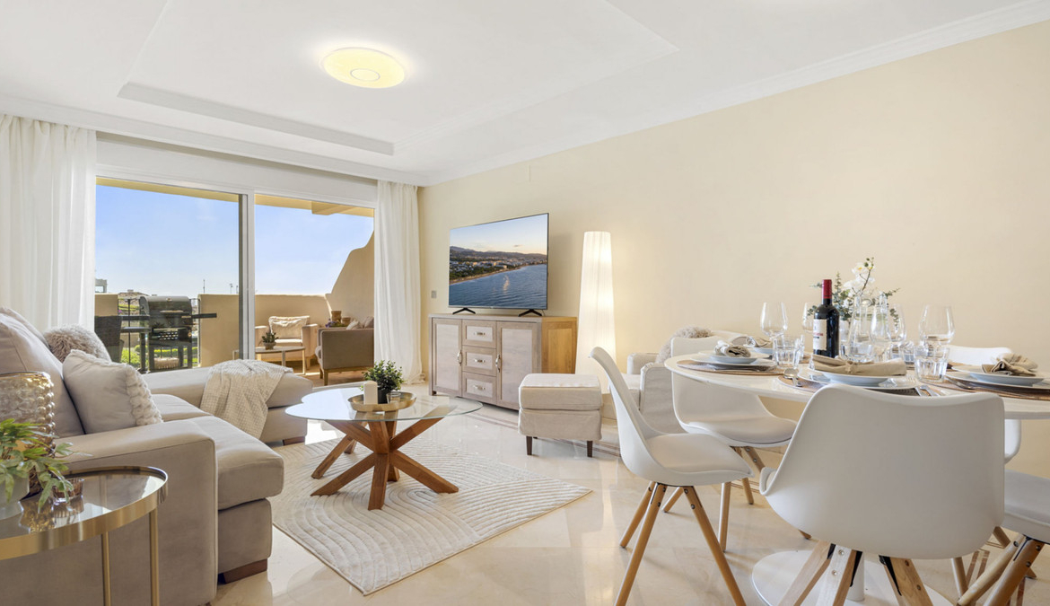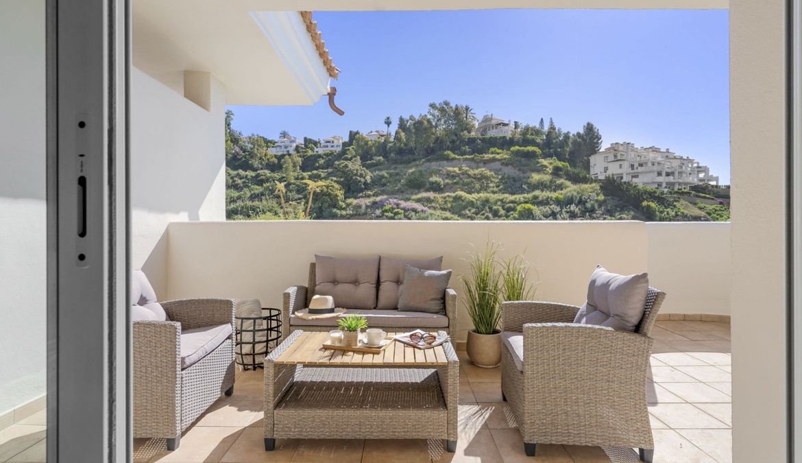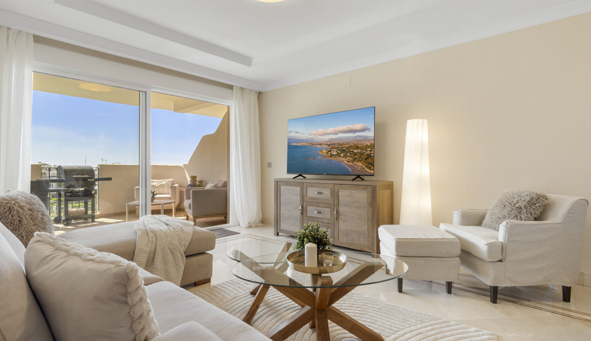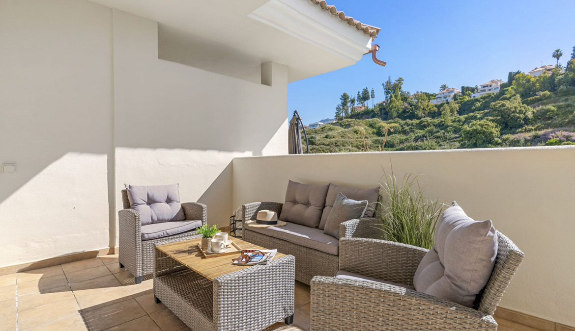 Nestled in the prestigious Aloha Hill Club, this stylish 2-bedroom, 2-bathroom home offers a built size of 124 m² plus 35 m² of terraces, designed to bring in light and capture sweeping sea views. Its southeast orientation ensures brilliant morning light and a warm, welcoming ambiance throughout the day.