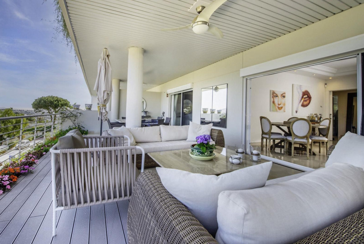 Furnished apartment of 143 square meters inside has 2 large bedrooms, 2 bathrooms, equipped kitchen, living room and a 60 square meter terrace facing east with incredible panoramic views of mountains, golf and sea.