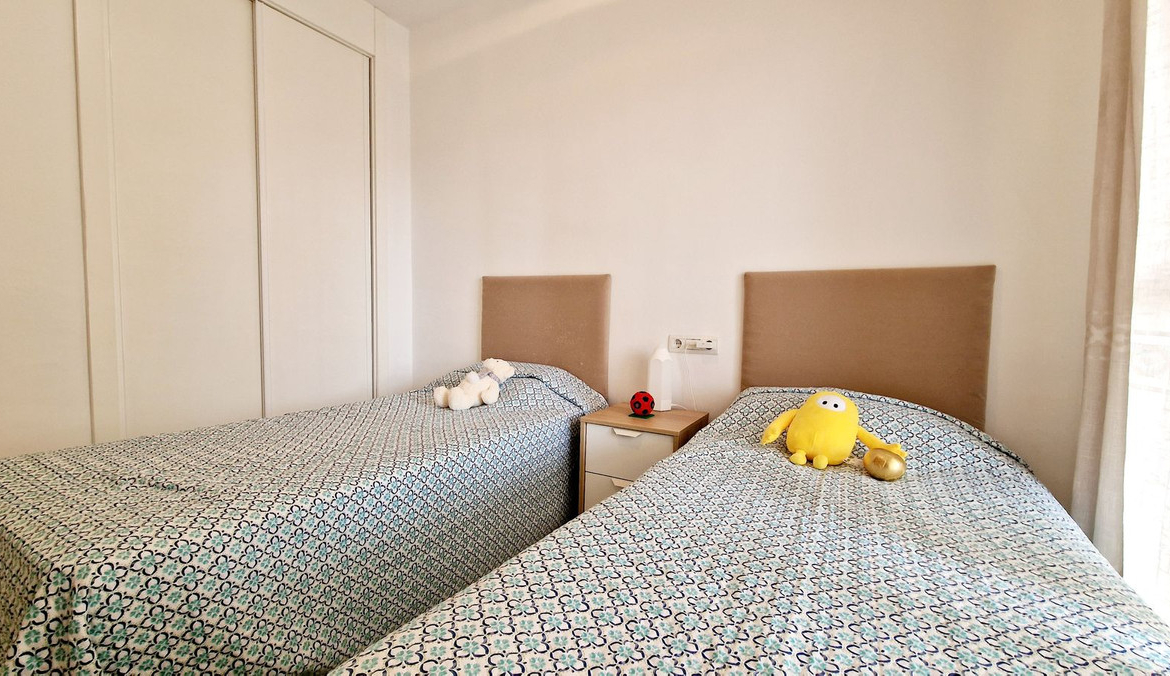 This cozy apartment has 2 bedrooms with built-in wardrobes and one full bathroom. The kitchen is fully equipped. The bright living room has direct access to an east and south-facing terrace, where you can enjoy unobstructed views of the communal gardens and pool.