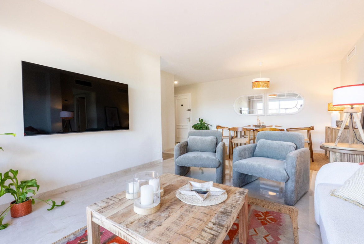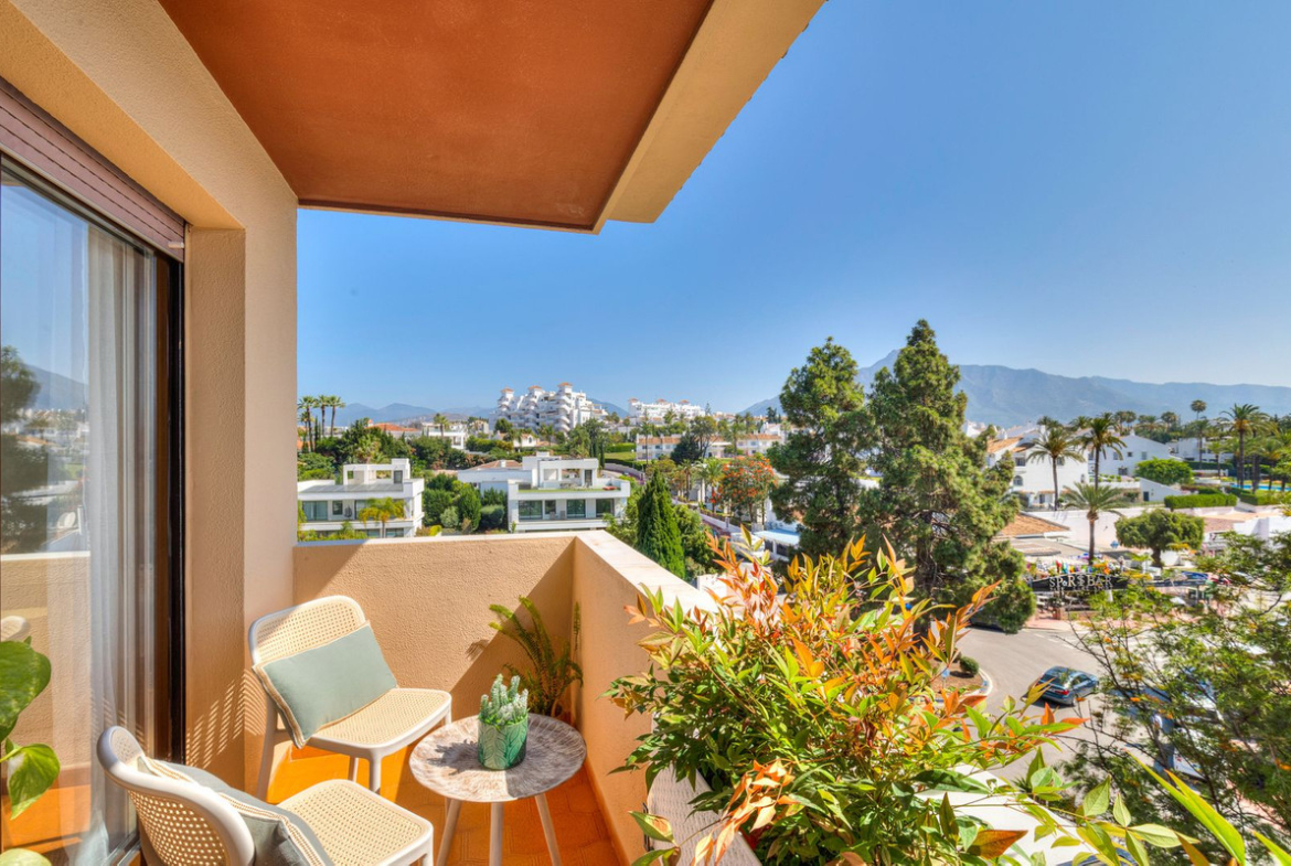 Bright and spacious recently renovated two-bedroom, two-bathroom apartment with two terraces and stunning mountain and sea views, just a 12-minute walk (2 minutes by car) from the beach and Puerto Banús. Located in a gated community with a swimming pool and surrounded by all services.