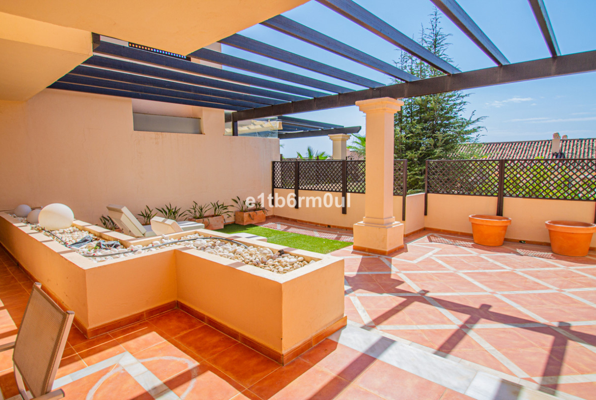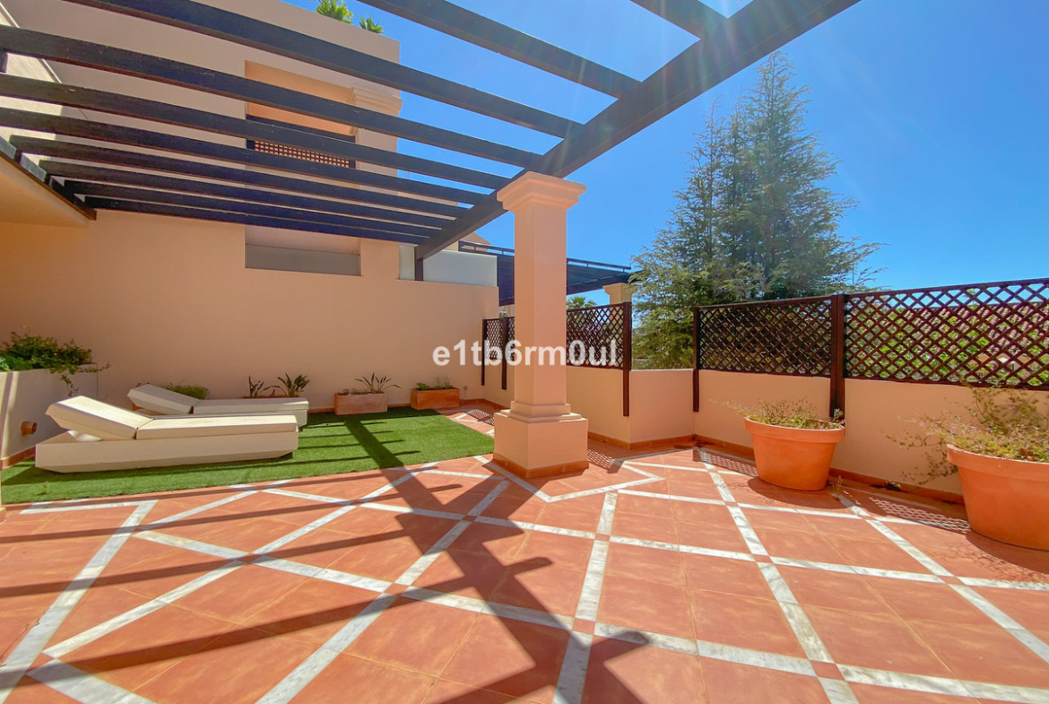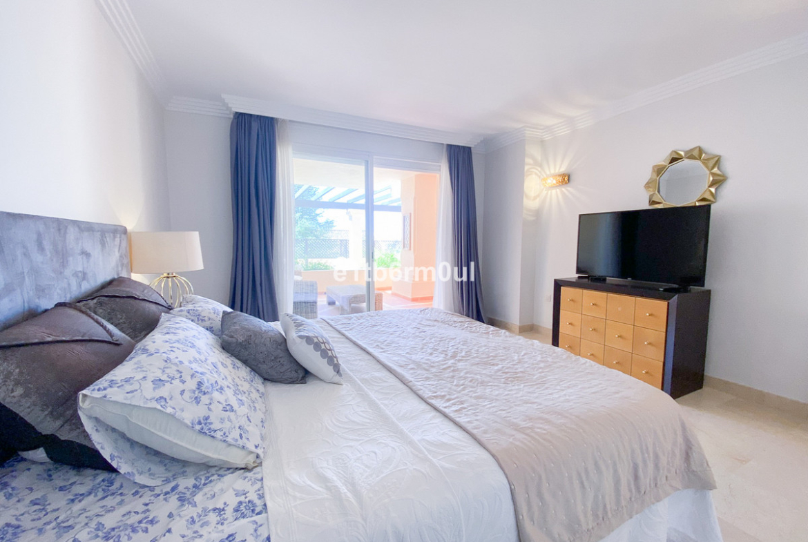 Fully secure gated community offering 24hr security, three outdoor pools, a gym, tennis court, and an indoor swimming pool. Surrounded by golf course in the Golf Valley of Nueva Andalucia this is a perfect apartment for a golf lover. The accommodation consists of a large entrance hallway, galley kitchen with breakfast seating area and laundry room. Large living / dining room with working fireplace. Guest WC. Both bedrooms are ensuite with fitted wardrobes, one bedroom has access to a private terrace. Large terrace with space for a jacuzzi. Carparking space in the communal parking included.