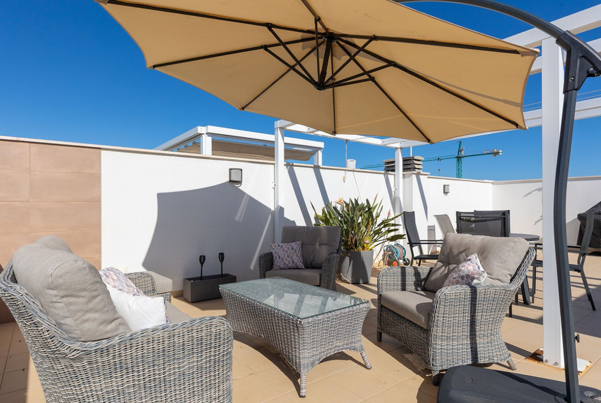 Perched in the center of the town of Pilar de la Horadada, this stylish 2-bedroom, 2-bathroom penthouse offers the perfect combination of modern design, generous outdoor space, and relaxed coastal living—all within walking distance of shops, restaurants, cafés, and everyday amenities.
