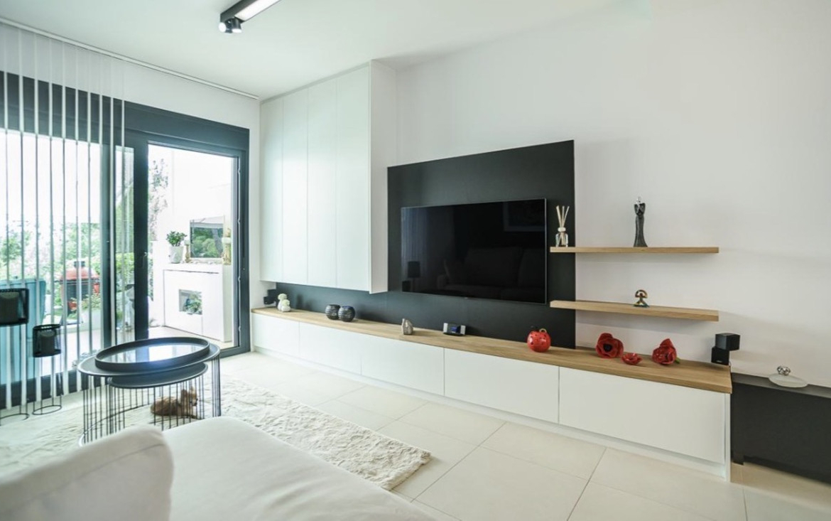 This modern apartment, completed in early 2025, combines modern architecture with refined finishes. The open plan kitchen with integrated appliances exudes class thanks to its sleek matte white fronts and thoughtful layout, the ideal place to cook and enjoy.The two luxurious bathrooms are true gems of comfort, equipped with a stylish vanity, mirror, toilet, and a spacious walk-in rain shower. The master bedroom is an oasis of tranquility with a private en-suite bathroom – your personal spa, every day.
