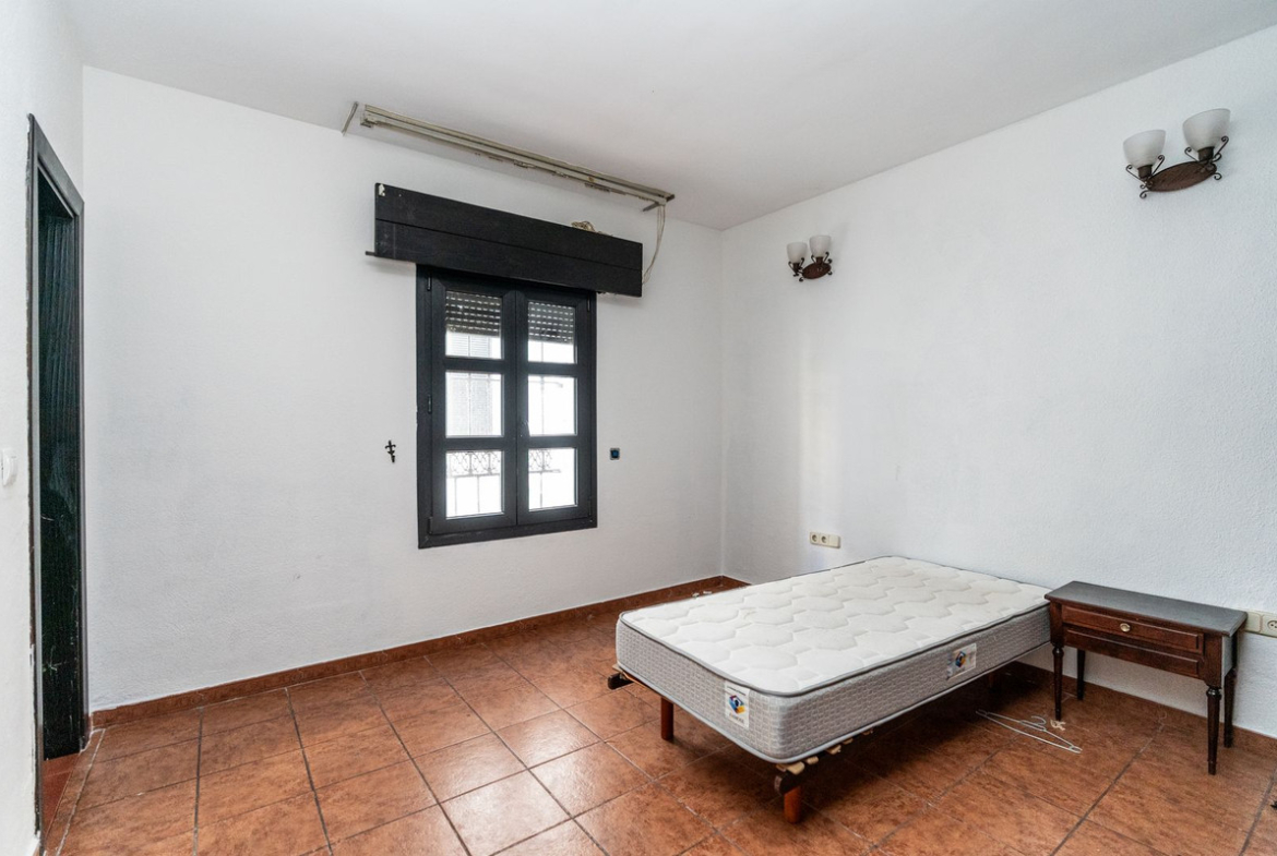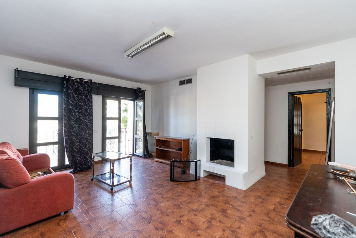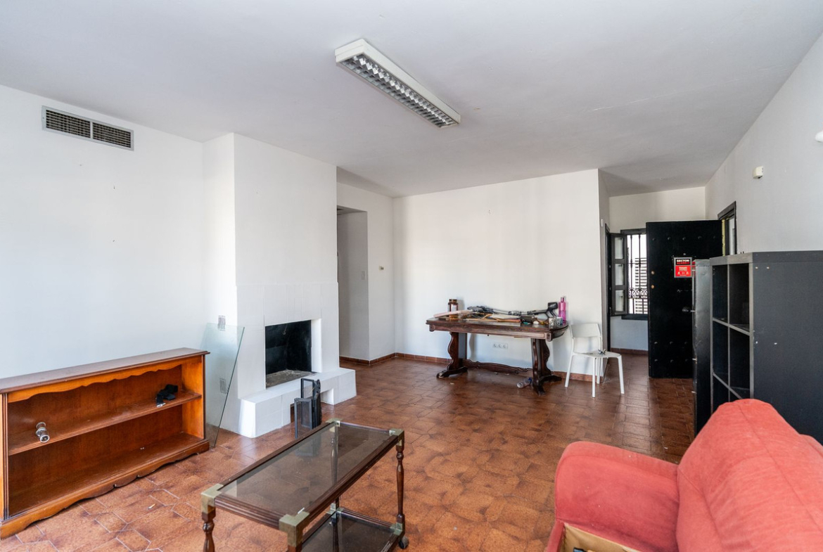 It features two large bedrooms, two bathrooms, and a spacious living room with a fireplace. The apartment needs renovation, offering flexibility for different layouts: the kitchen can be opened into the living area to create a larger open-plan space, or the same area can be used to add a third bedroom, depending on the buyer’s project.