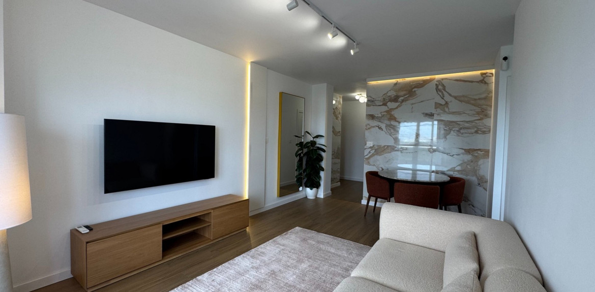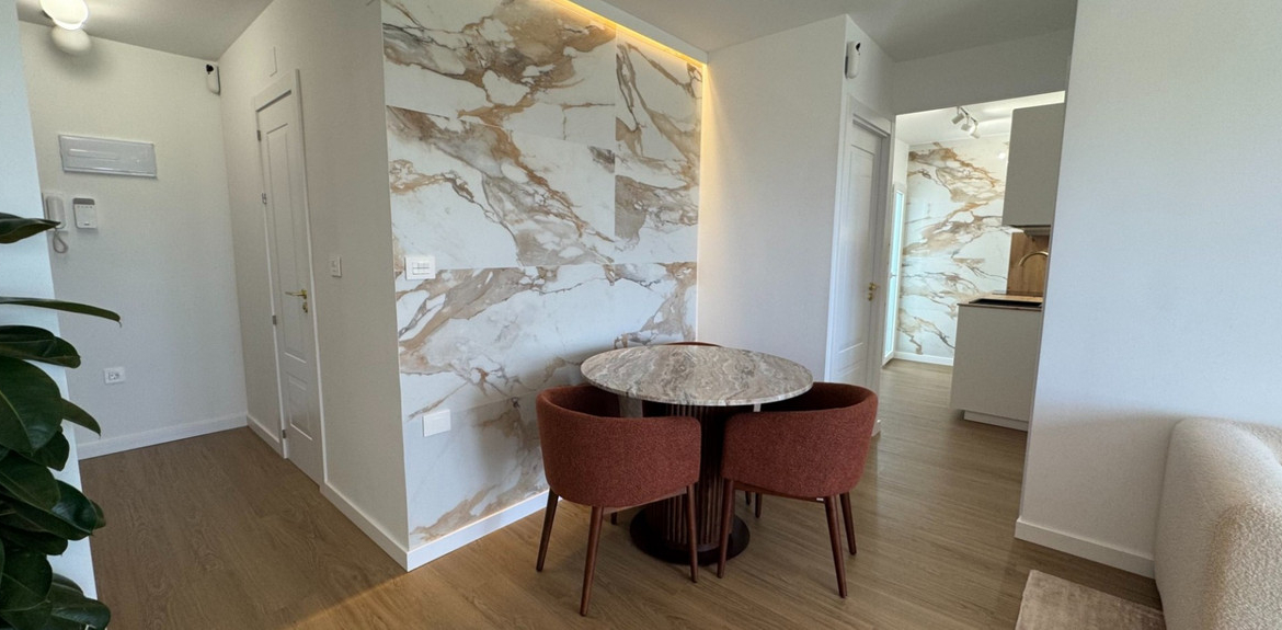 The interior features modern designer furniture, natural stone elements and large-format porcelain tiles. The fully equipped kitchen includes an induction hob and quality appliances. Comfort is ensured with inverter air conditioning with WiFi control, a programmable boiler and good insulation. The apartment is sold fully furnished and ready for immediate use.