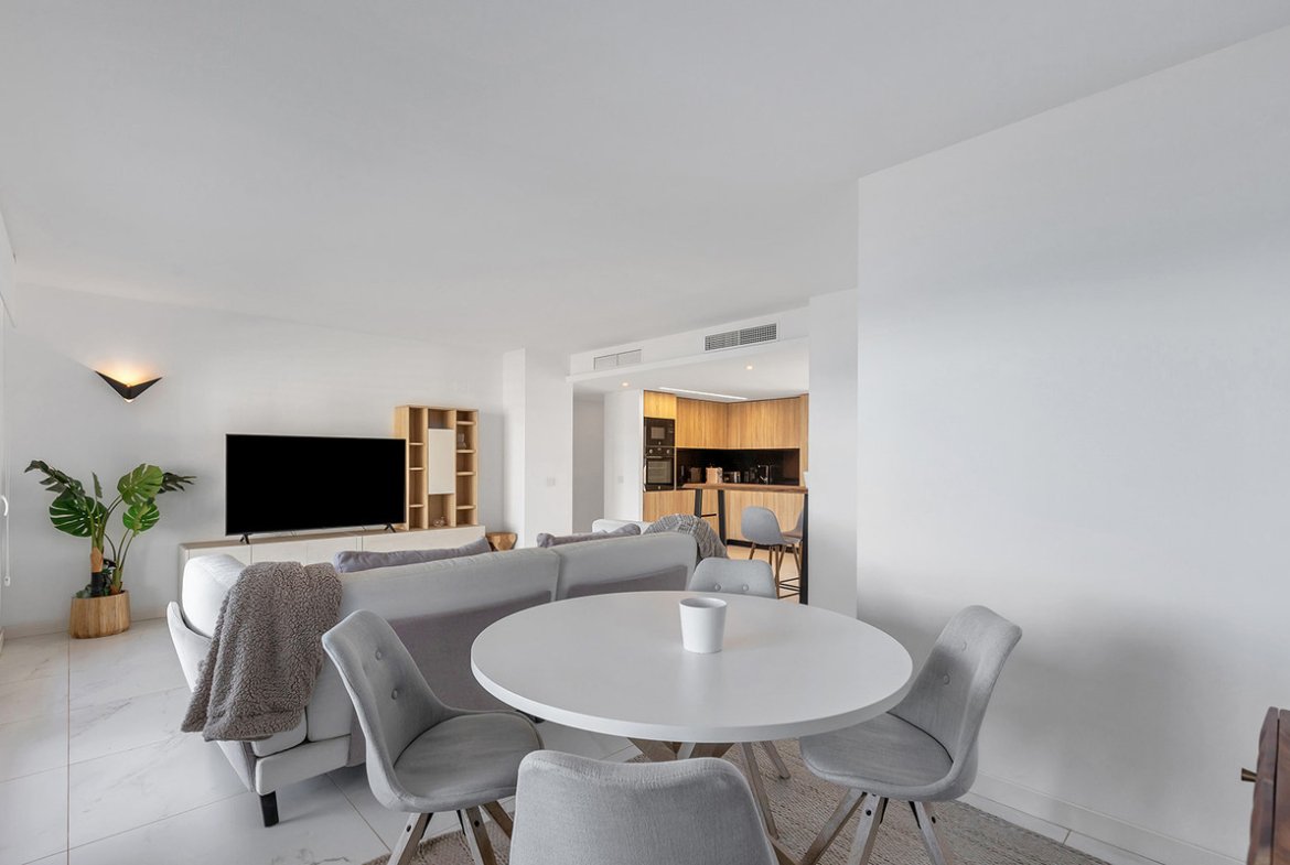 This exclusive 5th-floor apartment is located in the prestigious Posidonia residential complex, on the seafront in Punta Prima. Originally designed with three bedrooms, the property was modified off-plan to offer 94 m² of pure comfort, now distributed into two spacious bedrooms and two bathrooms, gaining exceptional spaciousness in the living areas.