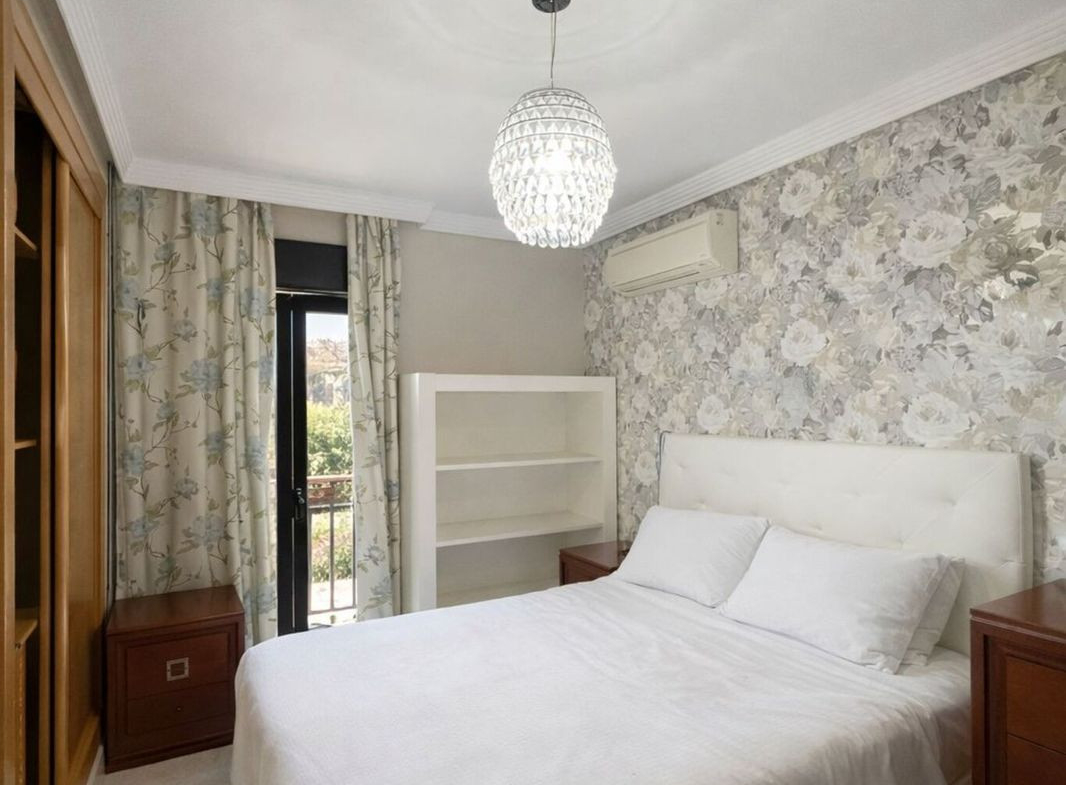 The interior layout offers two bedrooms and two bathrooms, including a master bedroom, a spacious living-dining room with a very cozy atmosphere, and a generously sized separate kitchen. The property has been modernized with a contemporary kitchen, renovated bathrooms, good quality flooring, and a neutral and elegant aesthetic. It has air conditioning, well-designed lighting, and practical storage solutions.