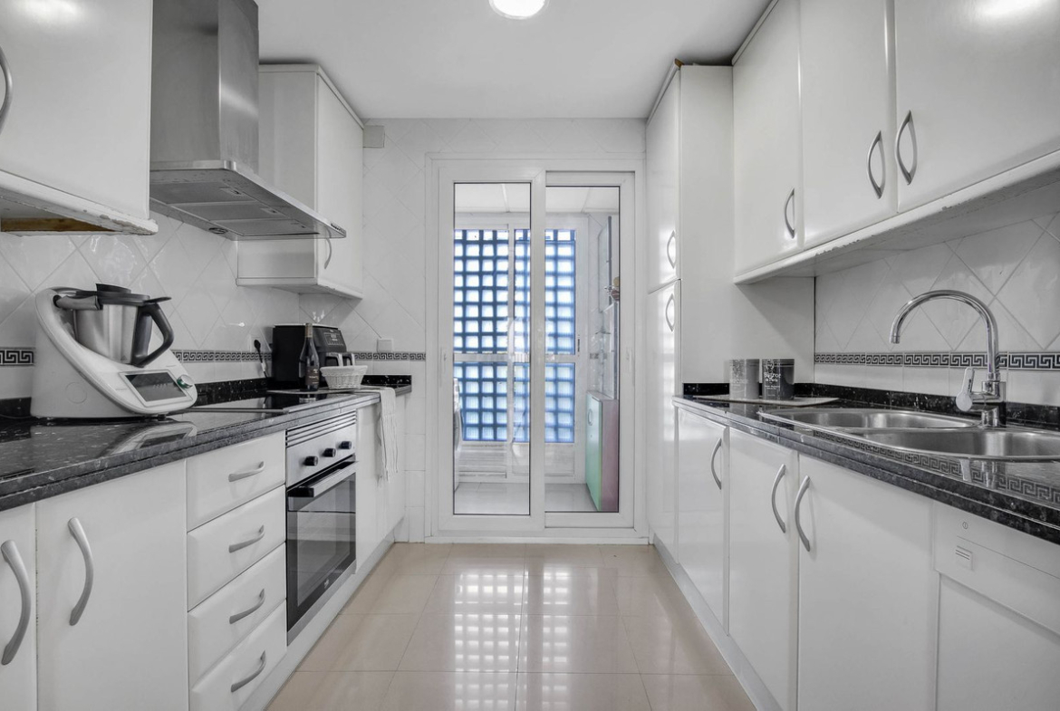 The master bedroom is generous in size and features an en-suite bathroom with double sink and walk-in shower, as well as three built-in wardrobes and access to the main terrace. The second bedroom, with white lacquered built-in wardrobes and a private balcony, is located next to a modern renovated bathroom with shower.