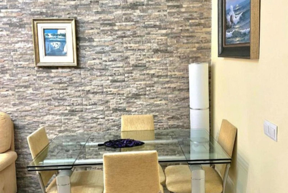 The property consists of two double bedrooms with fitted wardrobes, a spacious living-dining room, a bathroom with two sinks and a hydromassage shower, a designer kitchen with a breakfast bar, quartz worktop and top brand appliances, marble flooring, stone-decorated walls in the living room and master bedroom, large double-glazed windows, central air conditioning, video intercom, balcony in the living room with awning, reinforced entrance door and electronic key.
