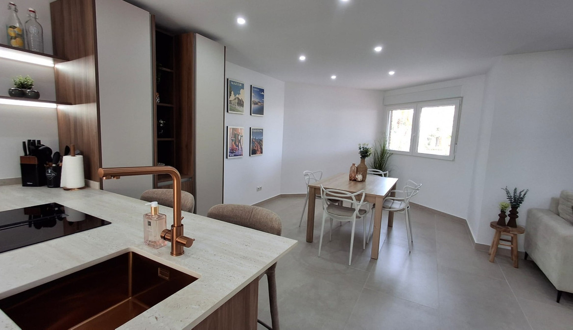 The property has been refurbished using high-quality materials and features a contemporary design with modern tiles, stylish decoration, and an elegant atmosphere that combines comfort and functionality. The living area is connected to an innovative open-plan kitchen with a central island, fully equipped and perfect for everyday living.